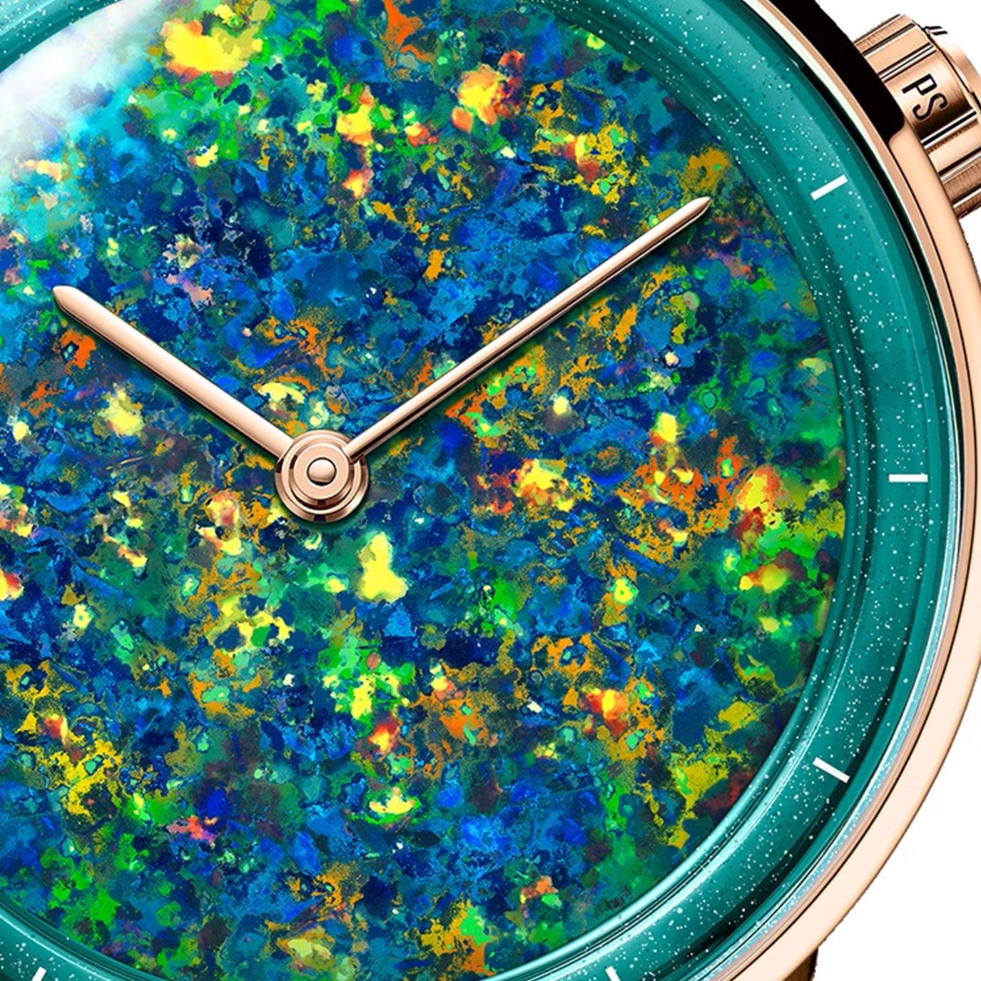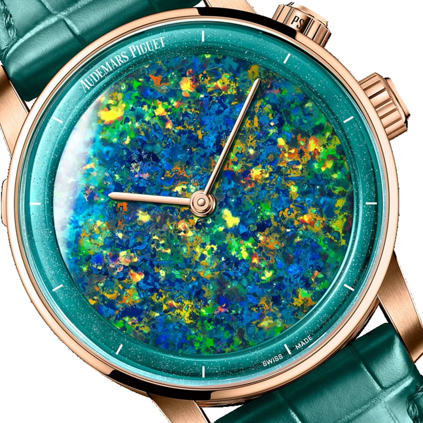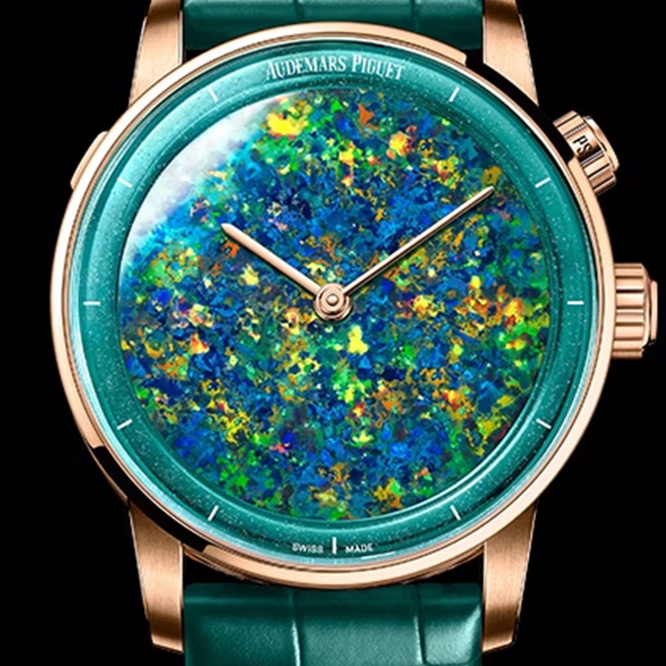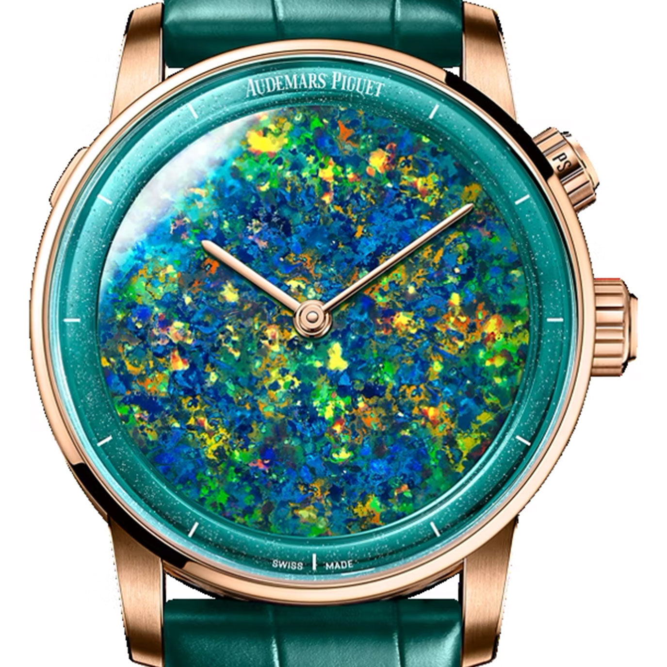 The Code 11.59 by Audemars Piguet Grande Sonnerie Carillon Supersonnerie “150th Anniversary” in 18-carat pink gold is a bold blend of architectural complexity and contemporary elegance. A harlequin opal lacquered dial with a sunburst pattern, applied pink gold hour-markers, and signature curved sapphire crystal, giving it a unique visual depth. Housed in a meticulously finished case that combines polished and brushed surfaces, the watch is powered by the in-house Calibre 2956. Paired with a green alligator strap, this model delivers striking aesthetics with uncompromising horological performance.