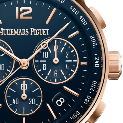 Unworn Audemars Piguet Code 11.59 PERPETUAL CALENDAR 26393OR.OO.A027KB.01. 41 mm, Lacquered blue dial and counters, 18-carat pink gold applied hour-markers and hands, 24-carat pink gold applied logo in galvanic growth, lacquered blue inner bezel, 18-carat pink gold case, glareproofed sapphire crystal and caseback, 4401 calibre, Selfwinding movement, 70 h power reserve, 40 jewels, Blue rubber-coated strap with 18-carat pink gold pin buckle. Water resistant to 30 m.