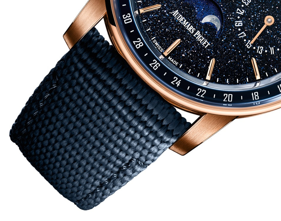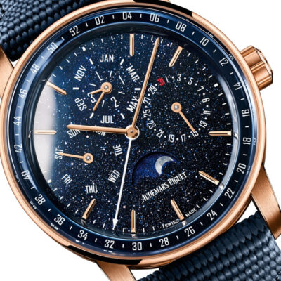 Unworn Audemars Piguet Code 11.59 PERPETUAL CALENDAR 26394OR.OO.D027KB.01. 41 mm, Blue aventurine dial and subdials, 18-carat pink gold applied hour-markers and hands, lacquered blue inner bezel, 18-carat pink gold case, glareproofed sapphire crystal and caseback, 5134 calibre, Selfwinding movement, 40 h power reserve, 38 jewels, Blue rubber-coated strap with 18-carat pink gold pin buckle. Water resistant to 20 m.
