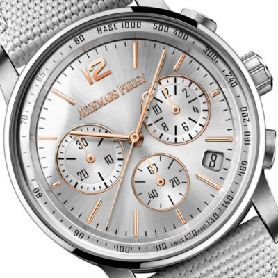Unworn Audemars Piguet Code 11.59 SELFWINDING CHRONOGRAPH 26393CR.OO.A008KB.01. 41 mm, Grey lacquered dial with sunray pattern base, pink gold applied hour-markers and hands, grey lacquered inner bezel, 18-carat pink gold case, white gold bezel, lugs and caseback, double glareproofed sapphire crystal and caseback, 4401 calibre, Selfwinding movement, 70 h power reserve, 40 jewels, Grey rubber-coated strap with 18-carat white gold pin buckle. Water resistant to 30 m.