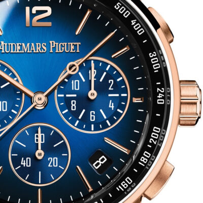Unworn Audemars Piguet Code 11.59 SELFWINDING CHRONOGRAPH 26393OR.OO.A002KB.03. 41 mm, Smoked lacquered blue dial with sunray pattern base, 18-carat pink gold applied hour-markers and hands, black lacquered inner bezel, 18-carat pink gold case, glareproofed sapphire crystal and caseback, 4401 calibre, Selfwinding movement, 70 h power reserve, 40 jewels, Black rubber -coated strap with 18-carat pink gold pin buckle. Water resistant to 30 m.