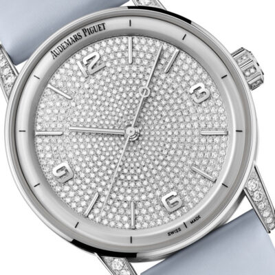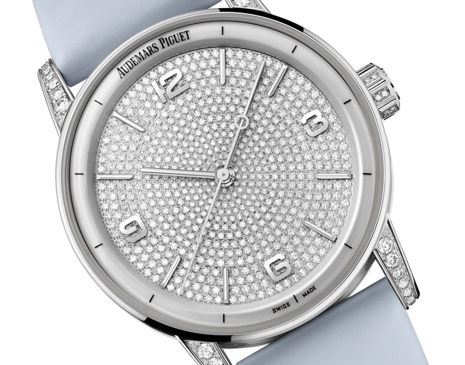 Unworn Audemars Piguet Code 11.59 SELFWINDING 15210BC.ZZ.D013VE.01. 41 mm, 18-carat white gold dial set with brilliant-cut diamonds, white gold applied hour-markers and hands, rhodium-toned inner bezel, 18-carat white gold case set with brilliant-cut diamonds, double glareproofed sapphire crystal and caseback, 4309 calibre, Selfwinding movement, 70 h power reserve, 32 jewels, Blue-grey satin-finished calfskin strap with 18-carat white gold AP folding clasp set with brilliant-cut diamonds. Water resistant to 30 m.