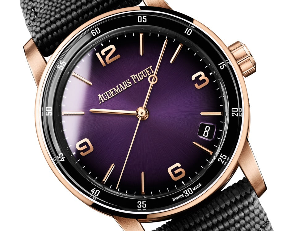 Unworn Audemars Piguet Code 11.59 SELFWINDING 15210OR.OO.A002KB.02. 41 mm, Smoked lacquered purple dial with sunray pattern base, 18-carat pink gold applied hour-markers and hands, black lacquered inner bezel, 18-carat pink gold case, double glareproofed sapphire crystal and caseback, 4302 calibre, Selfwinding movement, 70 h power reserve, 32 jewels, Black rubber strap with 18-carat pink gold pin buckle. Water resistant to 30 m.