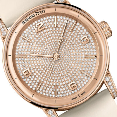 Unworn Audemars Piguet Code 11.59 SELFWINDING 15210OR.ZZ.D300VE.01. 41 mm, 18-carat pink gold dial set with brilliant-cut diamonds, pink gold applied hour-markers and hands, pink gold-toned inner bezel, 18-carat pink gold case set with brilliant-cut diamonds, double glareproofed sapphire crystal and caseback, 4309 calibre, Selfwinding movement, 70 h power reserve, 32 jewels, Beige satin-finished calfskin strap with 18-carat pink gold AP folding clasp set with brilliant-cut diamonds. Water resistant to 30 m.