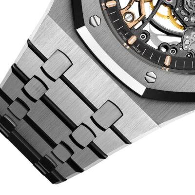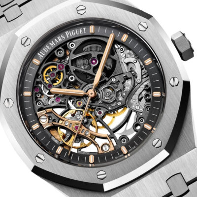 Unworn Audemars Piguet Royal Oak DOUBLE BALANCE WHEEL OPENWORKED 15407ST.OO.1220ST.01. 41 mm, Slate grey openworked dial, pink gold applied hour-markers and Royal Oak hands with luminescent coating, Stainless steel case, glareproofed sapphire crystal and caseback, screw-locked crown, 3132 calibre, Selfwinding movement, 45 h power reserve, 38 jewels, Stainless steel bracelet with AP folding clasp. Water resistant to 50 m.