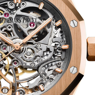 Unworn Audemars Piguet Royal Oak DOUBLE BALANCE WHEEL OPENWORKED 15467OR.OO.1256OR.01. 37 mm, Openworked rhodium-toned dial, pink gold applied hour-markers and Royal Oak hands with luminescent coating, 18-carat pink gold case, glareproofed sapphire crystal and caseback, screw-locked crown, 3132 calibre, Selfwinding movement, 45 h power reserve, 38 jewels, 18-carat pink gold bracelet with AP folding clasp. Water resistant to 50 m.