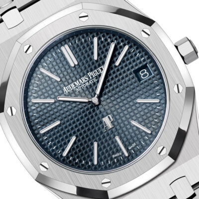 Unworn Audemars Piguet Royal Oak “JUMBO” EXTRA-THIN “50TH ANNIVERSARY” 16202ST.OO.1240ST.01. 39 mm, “Bleu nuit nuage 50” dial with “Petite Tapisserie” pattern, white gold applied hour-markers and Royal Oak hands with luminescent coating, Stainless steel case, glareproofed sapphire crystal and caseback, 7121 calibre, Selfwinding movement, 55 h power reserve, 33 jewels, Stainless steel bracelet with 18-carat pink gold AP folding clasp. Water resistant to 50 m.