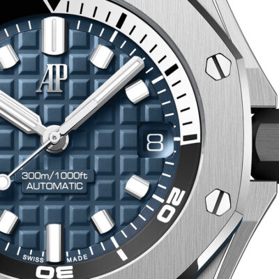 Unworn Audemars Piguet Royal Oak Offshore DIVER 15720ST.OO.A027CA.01. 42 mm, Blue dial with “Méga Tapisserie” pattern, white gold applied hour-markers and Royal Oak hands with luminescent coating, black rotating inner bezel with zone from 60 to 15 minutes in white, Stainless steel case, glareproofed sapphire crystal and caseback, black ceramic screw-locked crowns, 4308 calibre, Selfwinding movement, 60 h power reserve, 32 jewels, Blue rubber strap with AP folding clasp. Water resistant to 300 m.