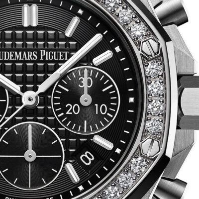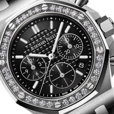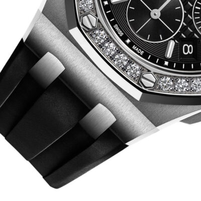 Unworn Audemars Piguet Royal Oak Offshore SELFWINDING CHRONOGRAPH 26231ST.ZZ.D002CA.01. 37 mm, Black dial with new “Lady Tapisserie” pattern, circular-grained external zone, white gold applied hour-markers and Royal Oak hands with luminescent coating, Stainless steel case, glareproofed sapphire crystal, diamond-set bezel, screw-locked crown, 2385 calibre, Selfwinding movement, 40 h power reserve, 37 jewels,  Black rubber strap with AP folding clasp. Water resistant to 50 m.