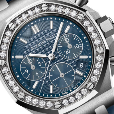 Unworn Audemars Piguet Royal Oak Offshore SELFWINDING CHRONOGRAPH 26231ST.ZZ.D027CA.01. 37 mm, Blue dial with “Lady Tapisserie” pattern, blue counters, blue external zone, white gold applied hour-markers and Royal Oak hands with luminescent coating, Stainless steel case, glareproofed sapphire crystal, diamond-set bezel, stainless steel pushpieces and screw-locked crown, 2385 calibre, Selfwinding movement, 40 h power reserve, 37 jewels, Blue rubber strap with AP folding clasp. Water resistant to 50 m.