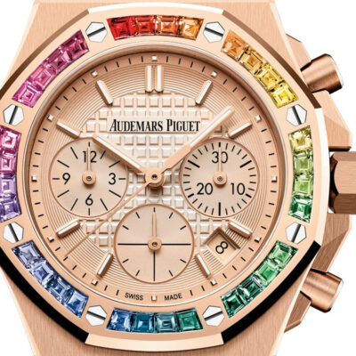 Unworn Audemars Piguet Royal Oak Offshore SELFWINDING CHRONOGRAPH 26236OR.YY.D085CA.01. 37 mm, Smoked pink gold-toned dial with “Lady Tapisserie” pattern, pink gold-toned counters, pink gold applied hour-markers and Royal Oak hands with luminescent coating, 18-carat pink gold case, glareproofed sapphire crystal, bezel set with baguette-cut “rainbow-coloured” sapphires, 18-carat pink gold pushpieces and screw-locked crown, 2385 calibre, Selfwinding movement, 40 h power reserve, 37 jewels, Beige rubber strap with AP folding clasp. Water resistant to 50 m.