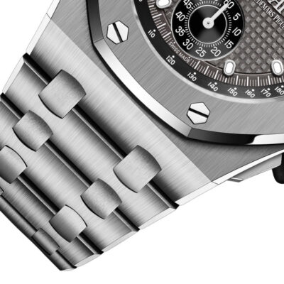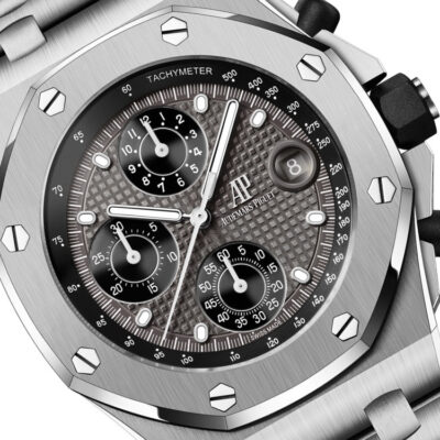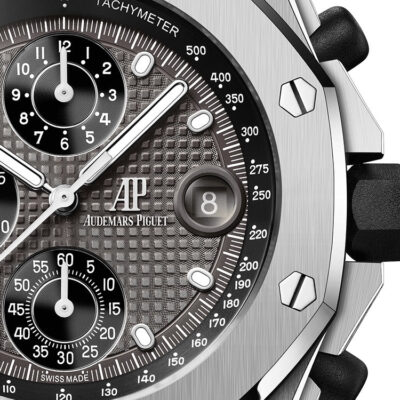Unworn Audemars Piguet Royal Oak Offshore SELFWINDING CHRONOGRAPH 26238TI.OO.2000TI.01. 42 mm, Grey dial with “Petite Tapisserie” pattern, black counters, white gold applied hour-markers and Royal Oak hands with luminescent coating, black inner bezel, Titanium case, glareproofed sapphire crystal and caseback, black rubber pushpieces and screw-locked crown, 4404 calibre, Selfwinding movement, 70 h power reserve, 40 jewels, Titanium bracelet with AP folding clasp. Water resistant to 100 m.