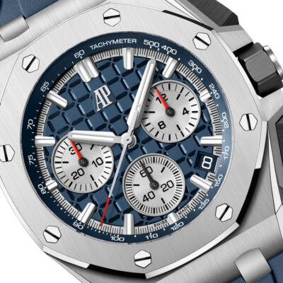 Unworn Audemars Piguet Royal Oak Offshore SELFWINDING CHRONOGRAPH 26420TI.OO.A027CA.01. 43 mm, Blue dial with “Méga Tapisserie” pattern, rhodium-toned counters and external zone, white gold applied hour-markers and Royal Oak hands with luminescent coating, blue inner bezel, Titanium case and bezel, glareproofed sapphire crystal and caseback, black ceramic pushpieces and screw-locked crown, sandblasted titanium pushpiece guards, 4401 calibre, Selfwinding movement, 70 h power reserve, 40 jewels, Blue rubber strap with AP folding clasp. Water resistant to 100 m.
