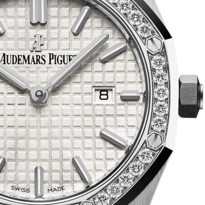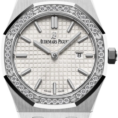 Unworn Audemars Piguet Royal Oak QUARTZ 67651ST.ZZ.1261ST.01, 33 mm, Silver-toned dial with “Grande Tapisserie” pattern, white gold applied hour-markers and Royal Oak hands with luminescent coating, Stainless steel case, 40 brilliant-cut diamonds, ~0.71 carats bezel, Quartz movement, 7 Jewels, Stainless steel bracelet with AP folding clasp. Water resistant to 50 m.