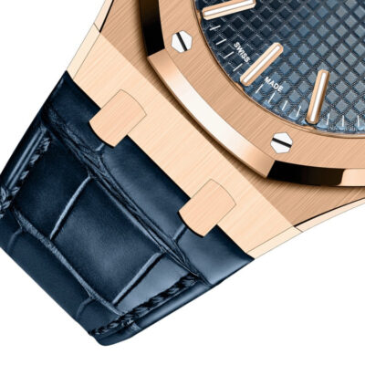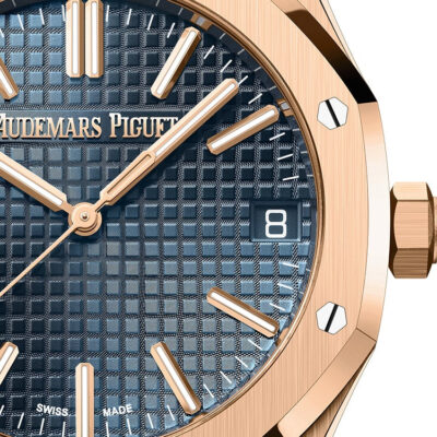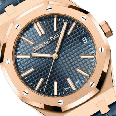 Unworn Audemars Piguet Royal Oak SELFWINDING “50TH ANNIVERSARY” 15510OR.OO.D315CR.01. 41 mm, Bleu nuit nuage 50 dial with “Grande Tapisserie” pattern, pink gold applied hour-markers and Royal Oak hands with luminescent coating, 18-carat pink gold case, glareproofed sapphire crystal and caseback, screw-locked crown, 4302 calibre, Selfwinding movement, 70 h power reserve, 32 jewels, Blue alligator strap with 18-carat pink gold AP folding clasp. Water resistant to 50 m.