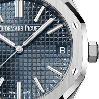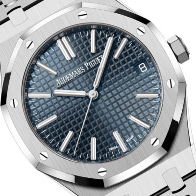 Unworn Audemars Piguet Royal Oak SELFWINDING “50TH ANNIVERSARY” 15510ST.OO.1320ST.01. 41 mm, Bleu nuit nuage 50 dial with “Grande Tapisserie” pattern, white gold applied hour-markers and Royal Oak hands with luminescent coating, Stainless steel case, glareproofed sapphire crystal and caseback, screw-locked crown, 5900 calibre, Selfwinding movement, 70 h power reserve, 32 jewels, Stainless steel bracelet with AP folding clasp. Water resistant to 50 m.