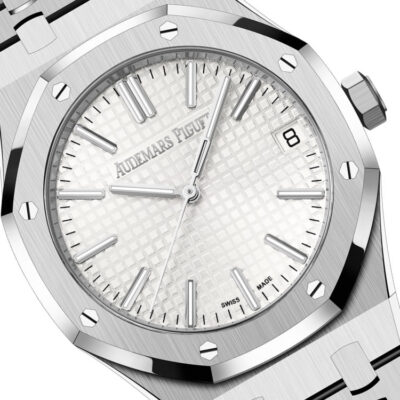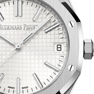 Unworn Audemars Piguet Royal Oak SELFWINDING “50TH ANNIVERSARY” 15510ST.OO.1320ST.03. 41 mm, Silver-toned dial with “Grande Tapisserie” pattern, white gold applied hour-markers and Royal Oak hands with luminescent coating, Stainless steel case, glareproofed sapphire crystal and caseback , screw-locked crown, 4302 calibre, Selfwinding movement, 70 h power reserve, 32 jewels, Stainless steel bracelet with AP folding clasp. Water resistant to 50 m.