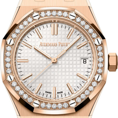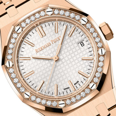 Unworn Audemars Piguet Royal Oak SELFWINDING “50TH ANNIVERSARY” 15551OR.ZZ.1356OR.01. 37 mm, Silver-toned dial with “Grande Tapisserie” pattern, pink gold applied hour-markers and Royal Oak hands with luminescent coating, 18-carat pink gold case, bezel set with brilliant-cut diamonds, glareproofed sapphire crystal and caseback, 5900 calibre, Selfwinding movement, 60 h power reserve, 29 jewels, 18-carat pink gold bracelet with AP folding clasp. Water resistant to 50 m.