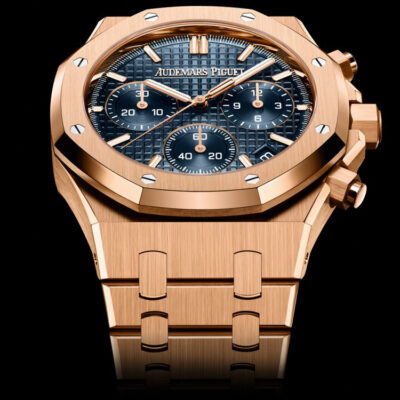 Unworn Audemars Piguet Royal Oak SELFWINDING CHRONOGRAPH “50TH ANNIVERSARY” 26240OR.OO.1320OR.01. 41 mm, “Bleu nuit nuage 50” dial with “Grande Tapisserie” pattern, “Bleu nuit nuage 50” counters, pink gold applied hour-markers and Royal Oak hands with luminescent coating, 18-carat pink gold case, glareproofed sapphire crystal and caseback, screw-locked crown, 4401 calibre, Selfwinding movement, 70 h power reserve, 40 jewels,  18-carat pink gold bracelet with AP folding clasp. Water resistant to 50 m.