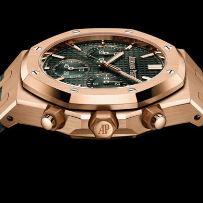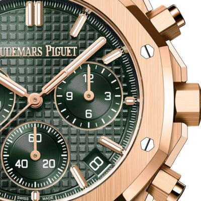 Unworn Audemars Piguet Royal Oak SELFWINDING CHRONOGRAPH “50TH ANNIVERSARY” 26240OR.OO.D404CR.01. 41 mm, Khaki green dial with “Grande Tapisserie” pattern, green counters, pink gold applied hour-markers and Royal Oak hands with luminescent coating, 18-carat pink gold case, glareproofed sapphire crystal and caseback, screw-locked crown, 4401 calibre, Selfwinding movement, 70 h power reserve, 40 jewels, Khaki green alligator strap with 18-carat pink gold AP folding clasp. Water resistant to 50 m.