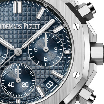 Unworn Audemars Piguet Royal Oak SELFWINDING CHRONOGRAPH “50TH ANNIVERSARY” 26240ST.OO.1320ST.01. 41 mm, Bleu nuit nuage 50 dial with “Grande Tapisserie” pattern, “Bleu nuit nuage 50” counters, white gold applied hour-markers and Royal Oak hands with luminescent coating, Stainless steel case, glareproofed sapphire crystal and caseback, screw-locked crown, 4401 calibre, Selfwinding movement, 70 h power reserve, 40 jewels, Stainless steel bracelet with AP folding clasp. Water resistant to 50 m.