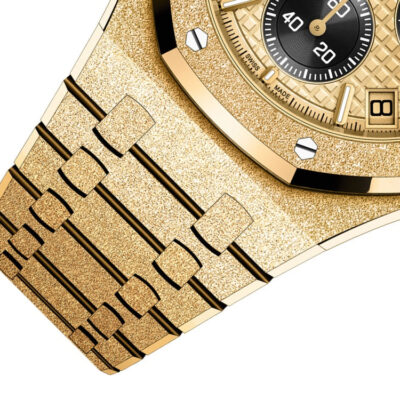 Unworn Audemars Piguet Royal Oak SELFWINDING CHRONOGRAPH 26240BA.GG.1324BA.01. 41 mm, Yellow gold-toned dial with “Grande Tapisserie” pattern, black counters, yellow gold applied hour-markers and Royal Oak hands with luminescent coating, Hammered 18-carat yellow gold case, glareproofed sapphire crystal, screw-locked crown, 4401 calibre, Selfwinding movement, 70 h power reserve, 37 jewels, Hammered 18-carat yellow gold bracelet with AP folding clasp. Water resistant to 50 m.