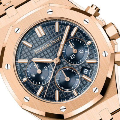 Unworn Audemars Piguet Royal Oak SELFWINDING CHRONOGRAPH 26715OR.OO.1356OR.01. 38 mm, Bleu nuit nuage 50 dial with “Grande Tapisserie” pattern, “Bleu nuit nuage 50” counters, pink gold applied hour-markers and Royal Oak hands with luminescent coating, 18-carat pink gold case, glareproofed sapphire crystal and caseback, screw-locked crown, 2385 calibre, Selfwinding movement, 40 h power reserve, 37 jewels, 18-carat pink gold bracelet with AP folding clasp. Water resistant to 50 m.