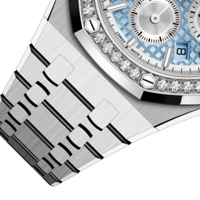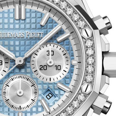 Unworn Audemars Piguet Royal Oak SELFWINDING CHRONOGRAPH 26715ST.ZZ.1356ST.01. 38 mm, Light blue dial with “Grande Tapisserie” pattern, silver-toned counters, white gold applied hour-markers and Royal Oak hands with luminescent coating, Stainless steel case, glareproofed sapphire crystal, screw-locked crown, 2385 calibre, Selfwinding movement, 40 h power reserve, 37 jewels, Stainless steel bracelet with AP folding clasp. Water resistant to 50 m.