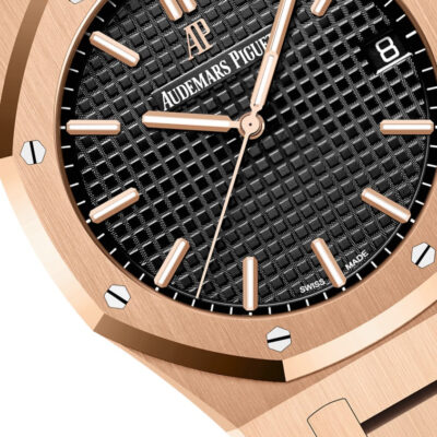 Unworn Audemars Piguet Royal Oak SELFWINDING 15500OR.OO.1220OR.01. 41 mm, Black dial with “Grande Tapisserie” pattern, pink gold applied hour-markers and Royal Oak hands with luminescent coating, 18-carat pink gold case, glareproofed sapphire crystal and caseback, screw-locked crown, 4302 calibre, Selfwinding movement, 70 h power reserve, 32 jewels, 18-carat pink gold bracelet with AP folding clasp. Water resistant to 50 m.