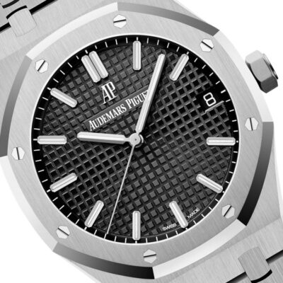 Unworn Audemars Piguet Royal Oak SELFWINDING 15500ST.OO.1220ST.03. 41 mm, Black dial with “Grande Tapisserie” pattern, white gold applied hour-markers and Royal Oak hands with luminescent coating, Stainless steel case, glareproofed sapphire crystal and caseback, screw-locked crown, 4302 calibre, Selfwinding movement, 70 h power reserve, 32 jewels, Stainless steel bracelet with AP folding clasp. Water resistant to 50 m.