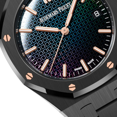 Unworn Audemars Piguet Royal Oak SELFWINDING 77350CE.OO.1266CE.02.A. 34 mm, Rainbow-coloured sapphire dial with polished mirror effect showcasing the Tapisserie geometry, pink gold Royal Oak hour-markers and hands, Black ceramic case, glareproofed sapphire crystal and titanium sapphire caseback, 5800 calibre, Selfwinding movement, 28 jewels, Black ceramic bracelet with AP folding clasp. Water resistant to 50 m.