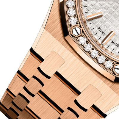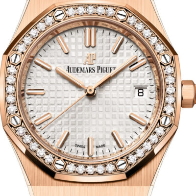 Unworn Audemars Piguet Royal Oak SELFWINDING 77351OR.ZZ.1261OR.01. 34 mm, Silver-toned dial with “Grande Tapisserie” pattern, pink gold applied hour-markers and Royal Oak hands with luminescent coating, 18-carat pink gold case, diamond-set bezel, glareproofed sapphire crystal and caseback, 5800 calibre, Selfwinding movement, 50 h power reserve, 28 jewels, 18-carat pink gold bracelet with AP folding clasp. Water resistant to 50 m.