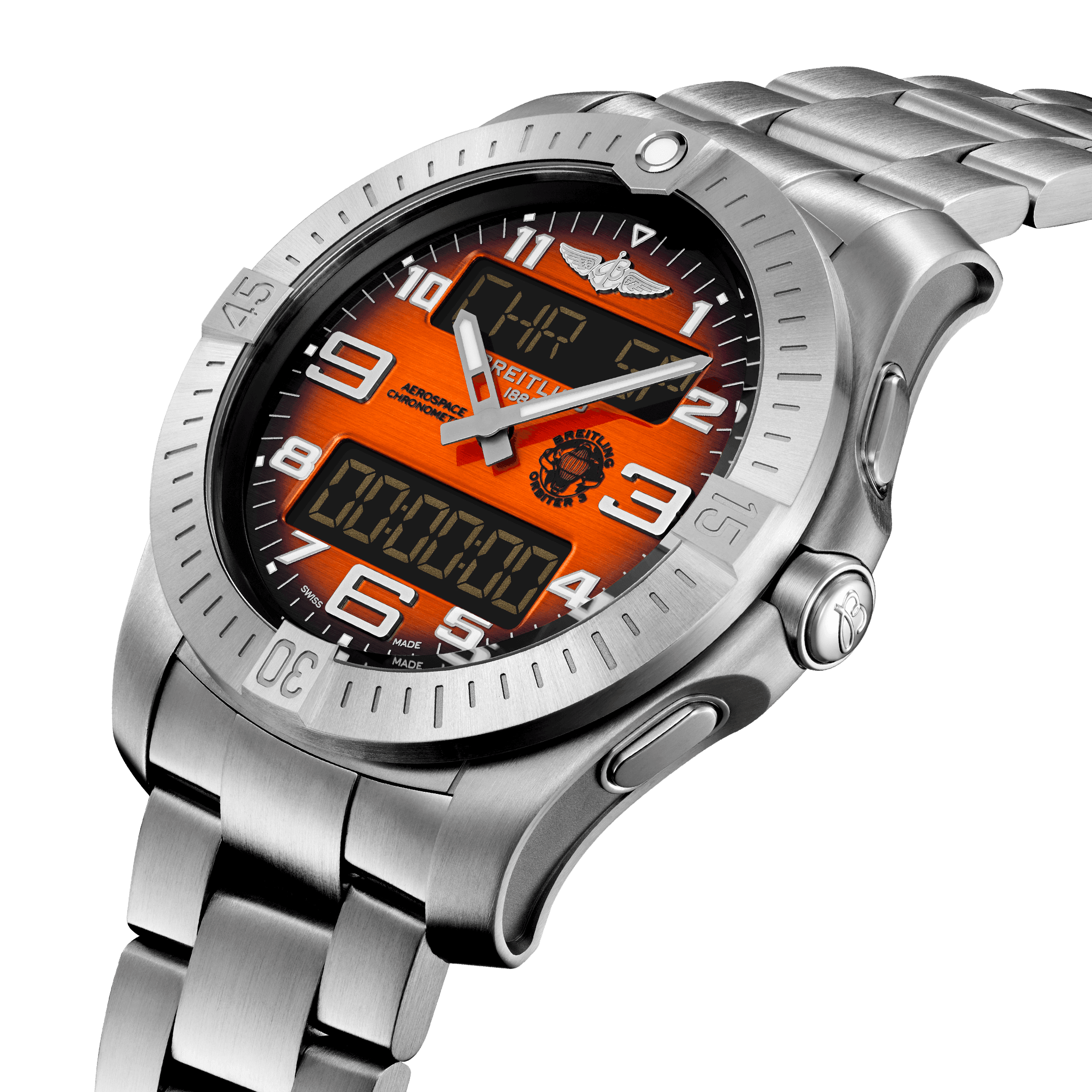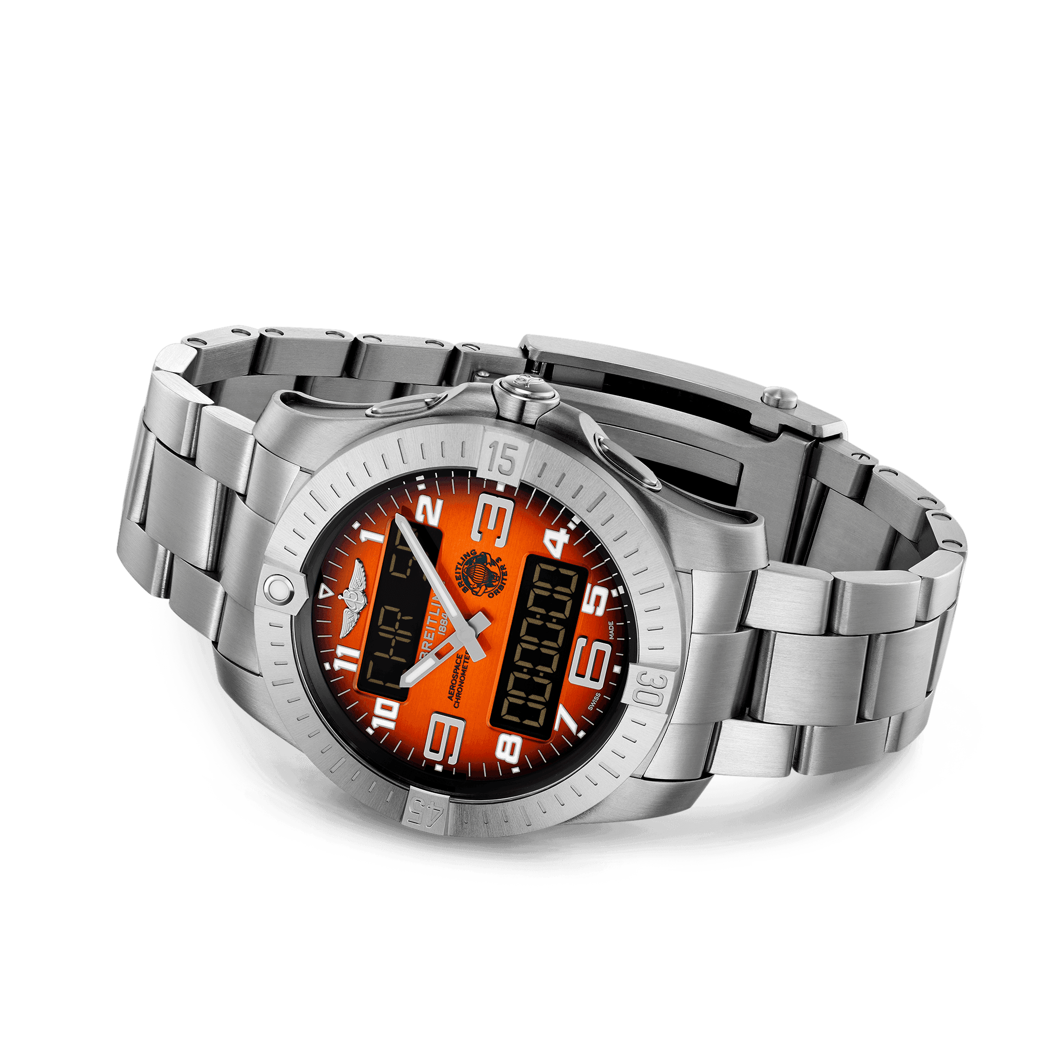 Unworn Breitling Watch Aerospace B70 Orbiter, Titanium case, Orange dial, Reference EB70101A1O1E1: Redefining Precision and Innovation in Aviation Timekeeping. Prepare to soar to new heights with the Breitling Aerospace B70, a true masterpiece of modern engineering and innovation. Designed with pilots and adventurers in mind, this cutting-edge timepiece seamlessly blends functionality, durability, and style to deliver unparalleled performance in the skies and beyond. The Aerospace B70 commands attention with its sleek and sophisticated design. Crafted from lightweight titanium, the 46mm case strikes the perfect balance between strength and comfort, making it the ideal companion for long flights or daring expeditions. The satin-brushed finish adds a touch of understated elegance, while the unidirectional rotating bezel and engraved compass scale serve as a reminder of this watch’s aviation heritage. But it’s the Aerospace B70’s advanced features that truly set it apart. Equipped with Breitling’s innovative SuperQuartz™ movement, this watch offers unparalleled precision, with an accuracy of ± 10 seconds per year. Whether you’re navigating through turbulent skies or timing critical maneuvers, you can trust that the Aerospace B70 will keep pace with your every move. But the Aerospace B70 is more than just a timekeeping instrument—it’s a multifunctional tool designed to enhance every aspect of your flying experience. With its digital and analog display, this watch provides a wealth of information at a glance, including a 1/100th of a second chronograph, countdown timer, second time zone, alarm, and calendar functions. Its intuitive user interface allows for easy navigation through its various features, ensuring that you stay focused on the task at hand, no matter how demanding the situation. In a world where every second counts, the Breitling Aerospace B70 is your trusted companion for conquering the skies with confidence and precision. Whether you’re a seasoned pilot or an aspiring aviator, let this extraordinary timepiece be your constant reminder to aim higher, fly farther, and never settle for anything less than excellence. The water resistance is up to 100m (330ft).