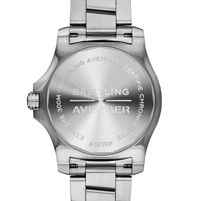Breitling Avenger AutomaticGMT 43 watch, 43mm, polished stainless steel case, Reference A32397101A1A1. This model has White dial with silver-tone hour and minutes hands with luminous fill and features an additional red hand indicating a second time zone also applied polished index hour markers with luminous fill. Fine printed minutes, seconds and fraction-of-a-second track. Date window displayed between the 3 o’clock positions. GMT/2nd Time Zone: Indicated by an additional red hour hand. The GMT hour hand make a single full revolution every 24-hours (moving at the half the pace of the regular hour hand). This hand points to 24-hour indications printed on the dial perimeter; the 24-hours indications are printed in Arabic numerals and point for the half hour markings. Stainless steel screw-locked crown and two gaskets. The crown has a special grip pattern and logo Breitling. The dial closed by a Cambered sapphire crystal, glareproofed both sides. The screwed solid case back is made of Stainless Steel. The watch is equipped unidirectional ratcheted Bezel with graduating Arabic Numerals 15, 30, 45 and indexes, a large luminous for the reference point. The watch is self-winding mechanical, 2nd timezone (24 hr) Breitling in-house caliber 32 contains 21 jewels and has an approximate power reserve of 42 hours. This model presented on a Stainless Steel bracelet with a Stainless Steel Fold over clasp with a safety release. The water resistance is up to 300m/1000ft.