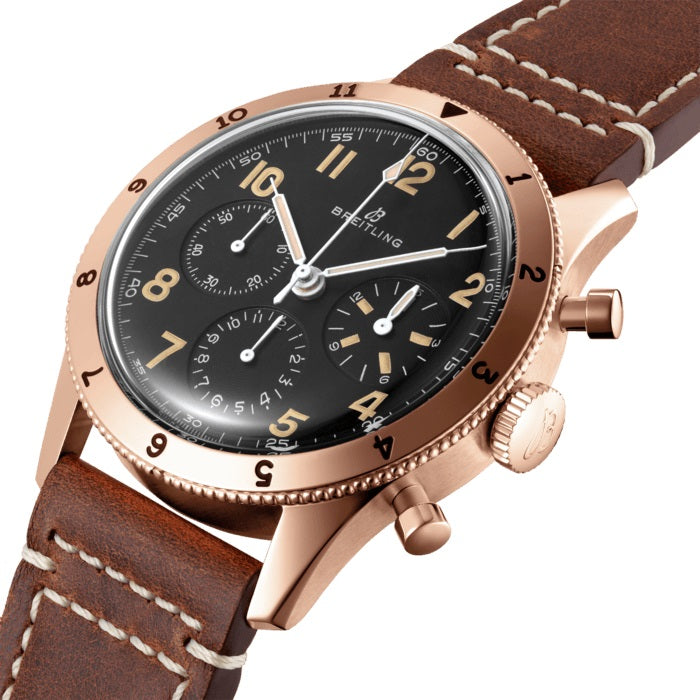 Breitling AVI 1953 Edition. Black dial 41 mm 18k Red Gold case. Plexiglas crystal. Breitling B09 (Manufacture) calibre, Mechanical hand-wound, 70 hrs power reserve, 34 jewels. Calfskin Leather strap Tang-type clasp. Water resistance 100 m (330 ft).