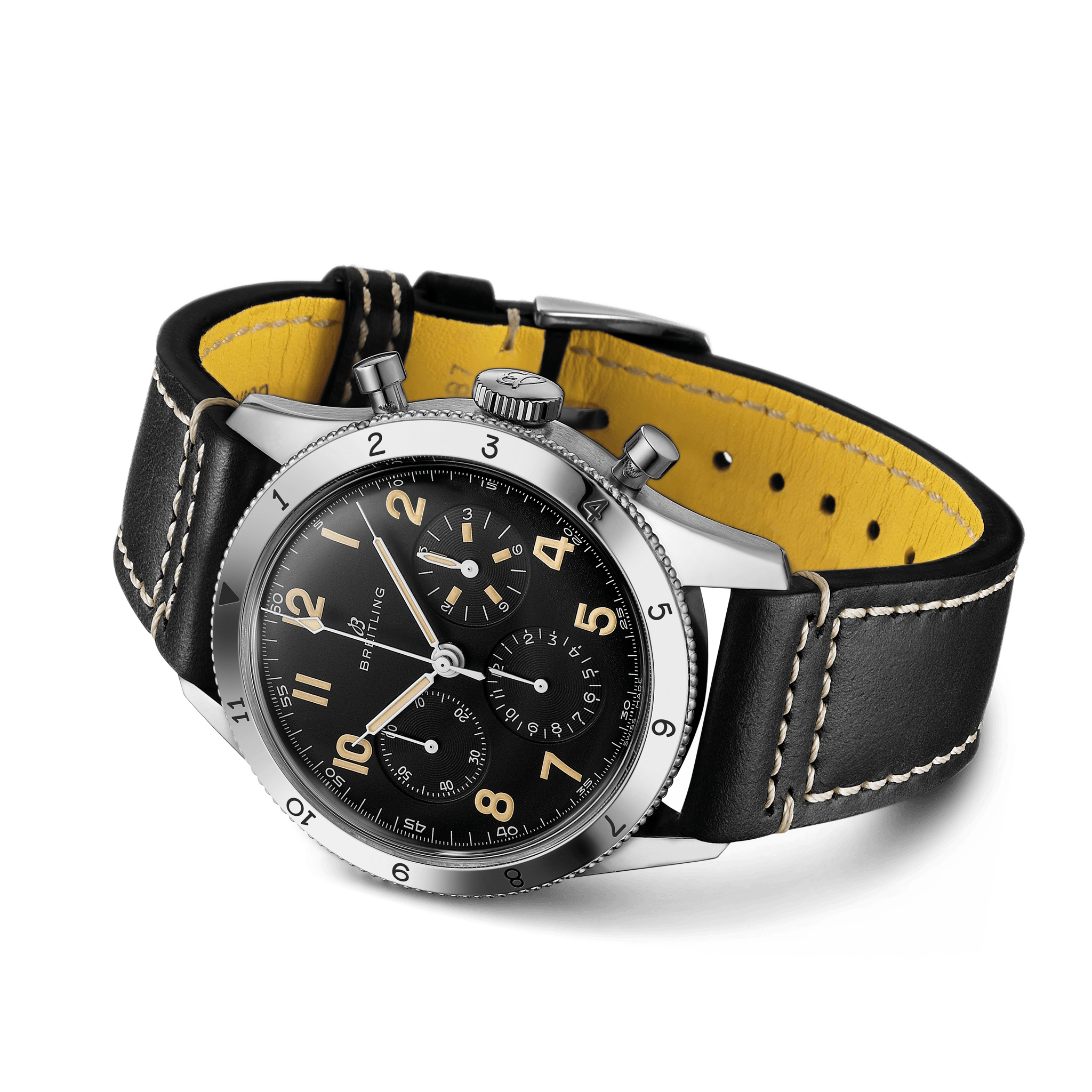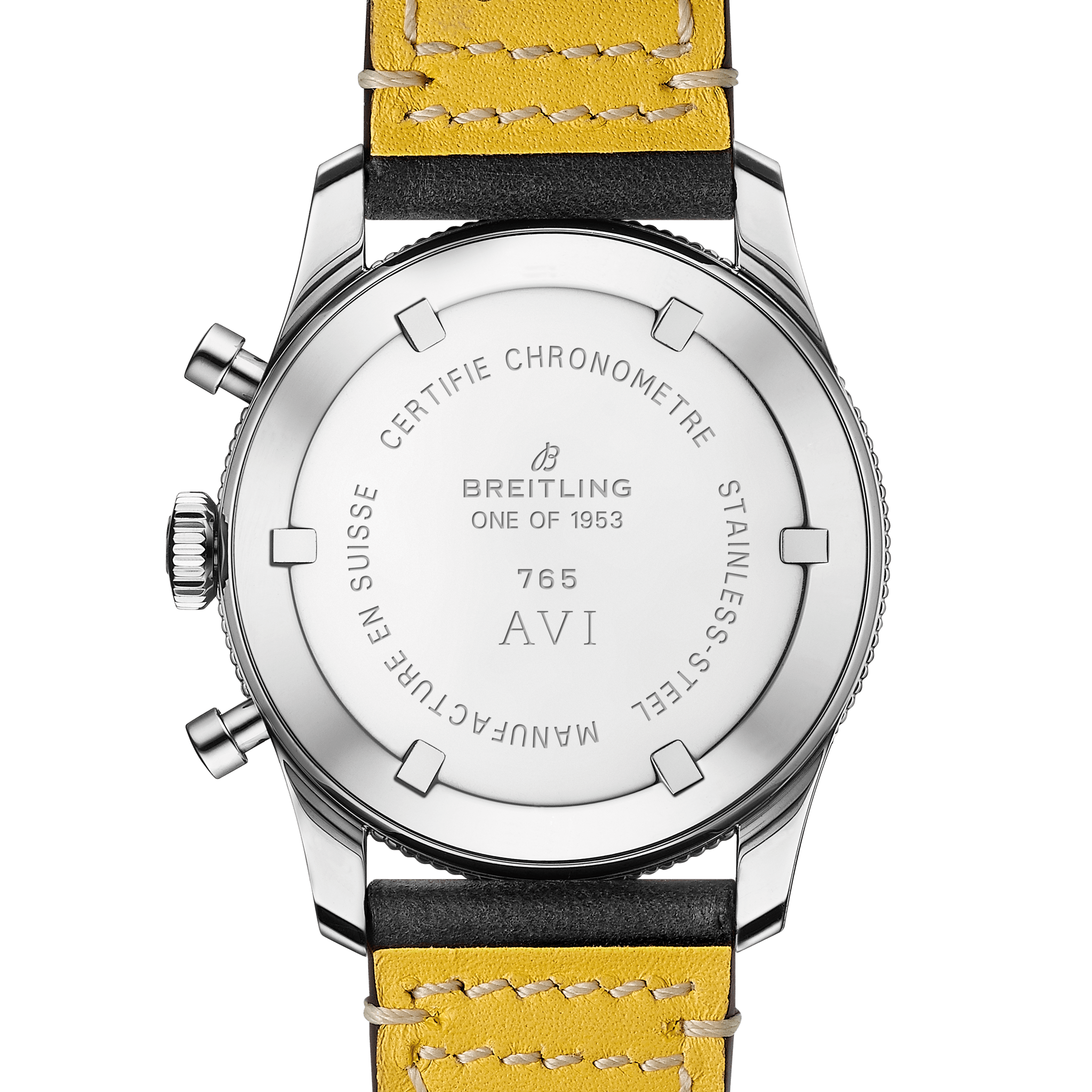 Unworn Breitling Men’s Watch AVI REF. 765 1953 Re-Edition brushed and polished Stainless Steel, 41mm, Reference AB0920131B1X1. A limited edition of 1953 pieces, each of which is engraved “ONE OF 1953”This model has Black main dial with black sub-dials. The watch is distinguished by has the same Arabic numerals as the original Co-Pilot from 1953, with tone-on-tone small seconds, 15-minute and 12-hour chronograph counters. The hand-applied Super-LumiNova color has been carefully chosen to recall the original luminescent material and gives the AVI Ref. 765 1953 Re-Edition an additional touch of vintage allure. Polished the hour and minute hands in Syringe shapes, with Vintage colored luminous fill. Fine printed minute/seconds track with 5-minute Arabic numerals intervals on the outer perimeter. The watch has polished Stainless steel screw-locked crown with two gaskets. The crown has a ribbed edge for a comfortable grip and Breitling logo. The dial closed by a Domed Hesalite (plastic) crystal. The watch has Stainless steel Screwed Solid case back. Small running seconds sub-dial located at the 9 o’clock position. Chronograph/Stopwatch functions: Column wheel mechanism; large central seconds hand counter, capable of keeping time up to 1/4th of a second; 15-minutes sub-dial counter located at the 3 o’clock position. Back in the 1950’s a pilot’s final plane check was expected to not exceed 15 minutes, hence, the importance of the 15-minute sub-dial with luminous indications; 12-hours counter sub-dial located at the 6 o’clock position. The watch is equipped Stainless Steel bidirectional rotating fluted bezel is secured by 3 screws that are placed in precisely the same positions as those on the watch from 1953, with labels in the form of Arabic numerals from 1 to 11 and a triangle at the origin. Breitling in house caliber B09 contains 34 jewels and has an approximate power reserve of 70 hours. The watch presented on a Black Calfskin Leather Strap on Yellow lining with Stainless Steel Tang Buckle Clasp. The water resistance is up to 30m/99Ft.