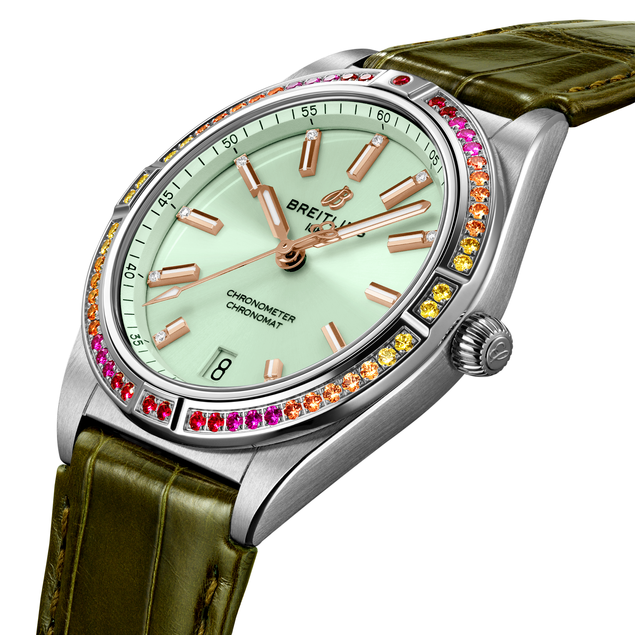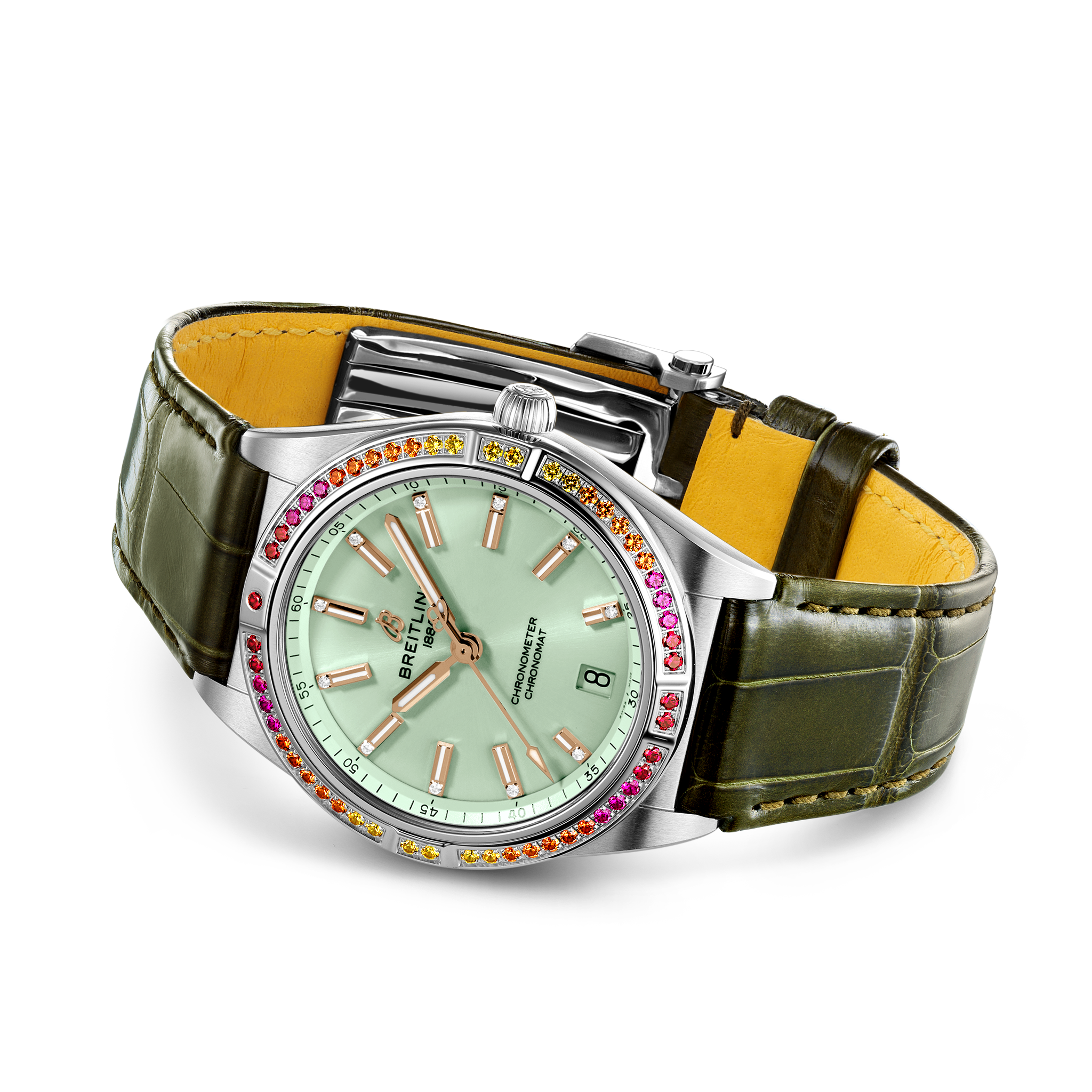 Unworn Ladies watch Breitling Chronomat Automatic 36 South Sea, case brushed and polished Stainless Steel, Diamonds and Gem, Reference A10380611L1P1. Meticulously crafted to embody elegance and functionality, this timepiece exudes a timeless charm that captivates the discerning eye. Crafted with meticulous attention to detail, they have an impeccable Mint green dial with a fine sunray finish, which is decorated with an 18k Red Gold «B” emblem below the 12 o’clock position. Perfect hour markers made of polished 18k Red Gold with crystal clear diamonds instead of luminous dots fill the dial with special luxury. Polished 18k Red Gold hands with luminous filling ensure high readability even in the dark. The slender 18k Red Gold seconds hand has a special design, having an arrowhead with luminescent filling and the manufacturer’s logo “B” on the other side. Along the outer perimeter of the dial is a finely printed minute/second track with Arabic numerals every 5 minutes. Date window located at the 6 o’clock position. The dial closed by a Cambered Scratch-resistant Sapphire Crystal with glare-proofed both sides. A screw-on, durable case back securely covers the watch mechanism. The polished Stainless Steel Non Screw-locked “onion” crown with two gaskets, a classic Chronomat feature named for its fluted-dome shape allows for easy adjustments. On its end there is Breitling logo is applied. The charming bezel made of polished stainless steel and decorated with precious stones gives the watch a special chic. The Model comes with Breitling Caliber 10 contains 25 Jewels and has an approximate power reserve of 42 hours. She is presented on Breitling’s iconic and comfortable Green alligator leather strap with contrasting off-white stitching, which fastens on Stainless Steel Folding Clasp. The water resistance is up to 100m/330ft.
