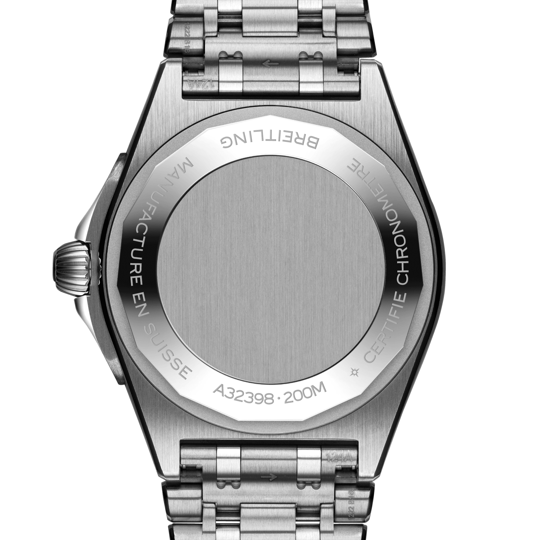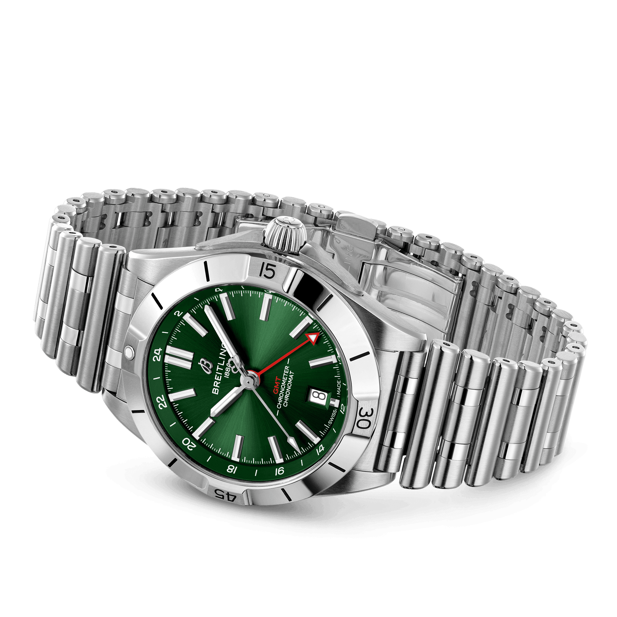 Unworn watch Breitling Chronomat Automatic GMT 40, brushed and polished Stainless Steel case, reference A32398101L1A1, is a timepiece that harmoniously combines precision engineering with timeless elegance. Crafted with meticulous attention to detail, they feature a sleek 40mm stainless steel case that combines sophistication and durability. Green dial with a fine sunray finish, which is decorated with a silver «B” emblem below the 12 o’clock position. This model features silver polished hour markers and hands that glow in the dark thanks to luminescent filling. They are harmoniously complemented by a thin silver second’s hand of a special design, which has a hand with luminescent filling and the manufacturer’s logo “B” on the other side. Date window located at the 6 o’clock position. The watch is powered by Breitling’s Caliber 32 automatic movement, which contains 21 jewels and has an approximate power reserve of 42 hours, making it possible to not only keep impeccable time, but also has a convenient GMT function that allows you to easily track multiple time zones. GMT/2nd Time Zone Function: the central Red hand indicates GMT/Dual Time zone with the luminous arrowhead tip pointing to the 24 hour indications on the dial flange; the GMT hour hand makes a single revolution once in 24 hours. The dial closed by a Cambered Scratch-resistant Sapphire Crystal with glare-proofed both sides. A screw-on, durable Stainless Steel case back securely covers the watch mechanism. The Screw-locked “onion” crown with two gaskets, a classic Chronomat feature named for its fluted-dome shape allows for easy adjustments. On end there is Breitling logo is applied. The watch features a polished Stainless Steel unidirectional rotating bezel with a ratcheting mechanism, a large luminous dot at the origin, and brushed raises in position 15, 30, 45 minute. The watch presented on the Featuring Breitling’s iconic and comfortable Rouleaux style Bracelet, which fastens Stainless steel Folding Clasp. The water resistance is up to 200m/660ft.