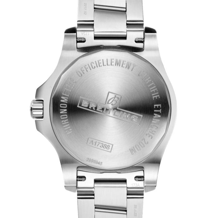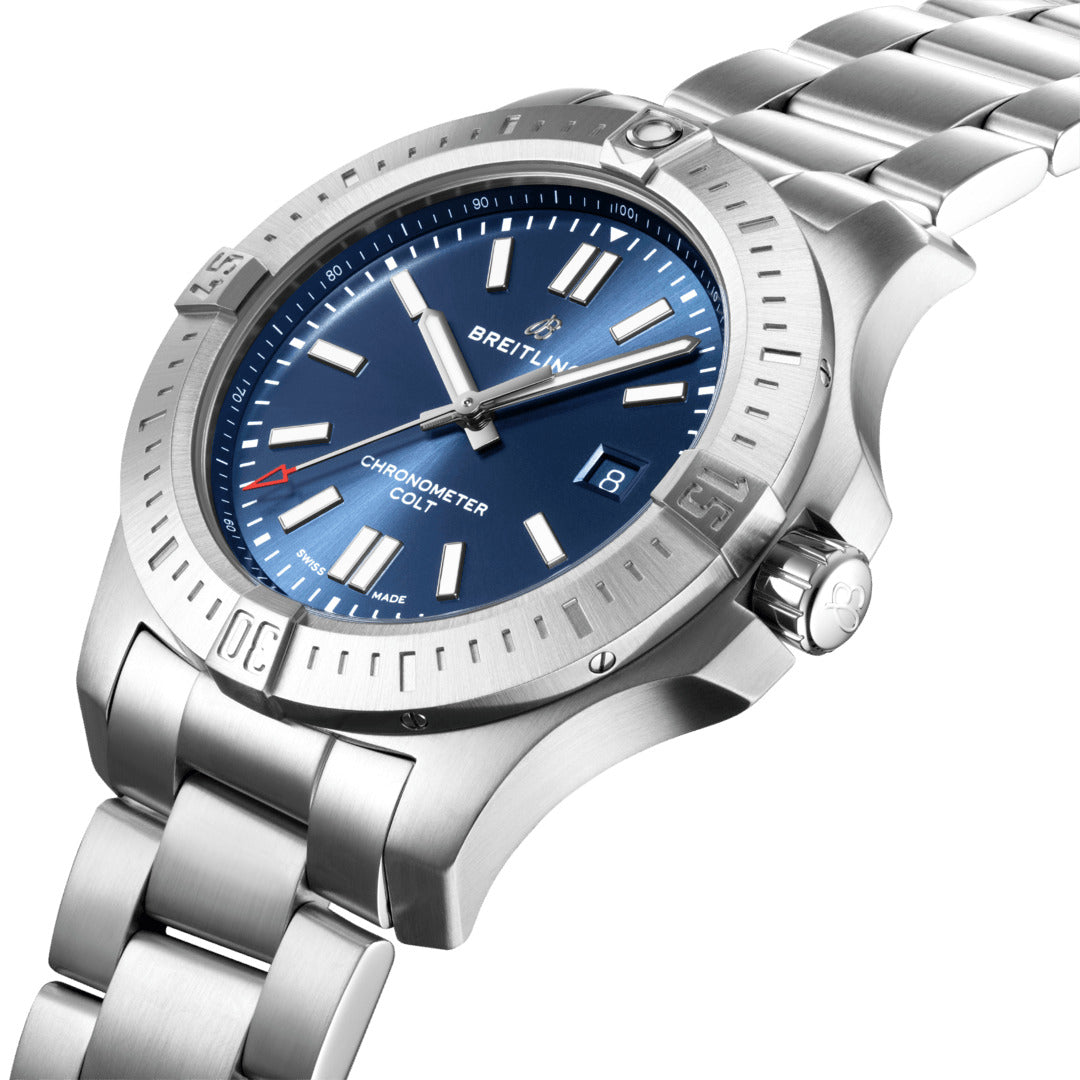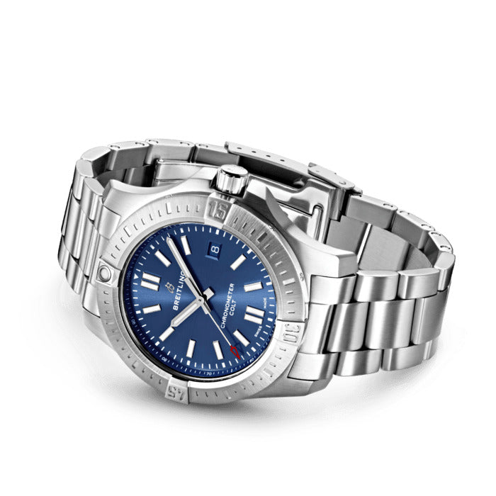 Breitling Chronomat Colt watch 44mm in stainless steel, Reference A17388101/C1A1. This model has sapphire crystal glare proofed on both sides. Blue dial with applied luminescent hour markers and luminescent filled hands. Red-tipped second hand. Unidirectional ratcheted rotating engraved Stainless Steel bezel. The watch is automatic with Breitling 17 self-winding movement with calendar via dial aperture, approximately 38 hours of power reserve. The watch presented on stainless steel Professional III bracelet with folding buckle. The water resistance is up to 200m/660ft (20ATM).