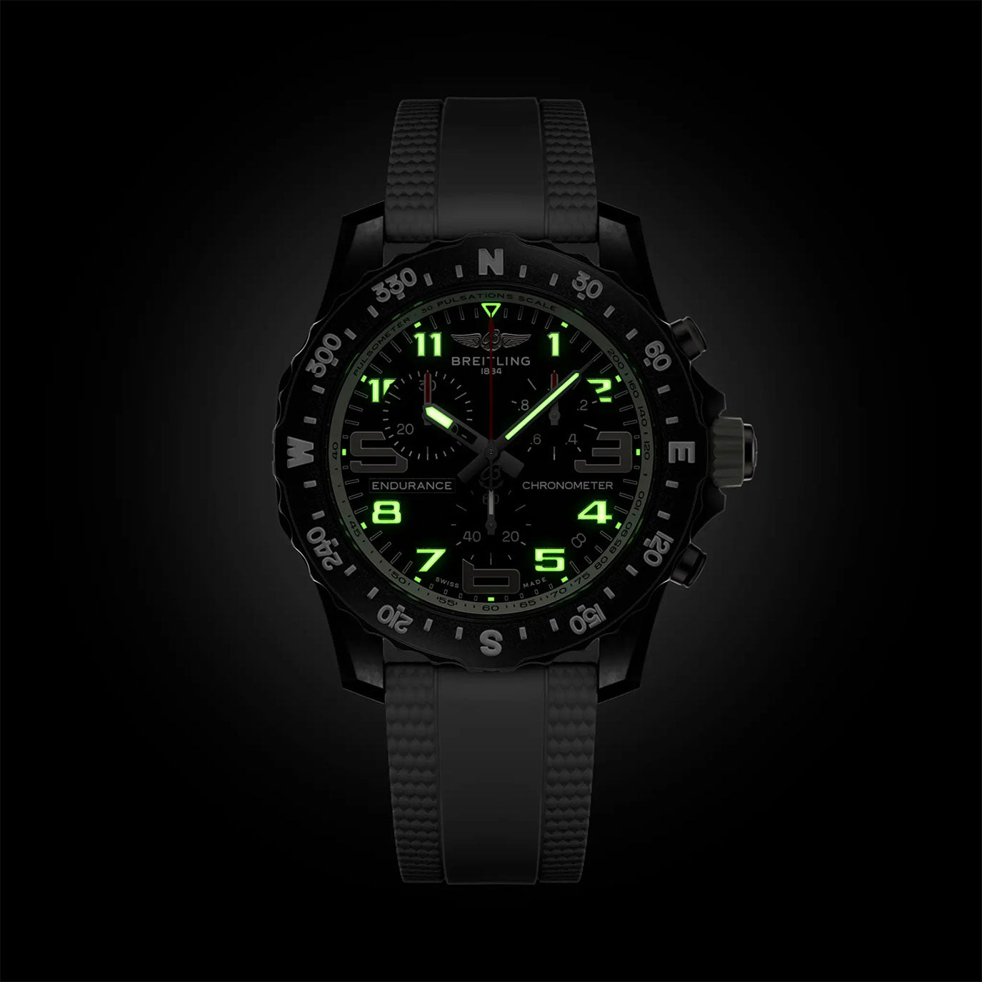 Introducing the Breitling Endurance Pro 44—a timepiece that masterfully combines precision, durability, and vibrant design. Tailored for athletes and adventurers, this watch features a thermocompensated SuperQuartz™ movement encased in ultra-light Breitlight®, ensuring exceptional accuracy and comfort. The black dial is complemented by a striking white rubber strap, creating a bold aesthetic suitable for any occasion. With a bidirectional compass scale bezel and water resistance up to 10 bars, the Endurance Pro 44 is designed to perform under pressure, whether you’re navigating the great outdoors or the urban jungle.