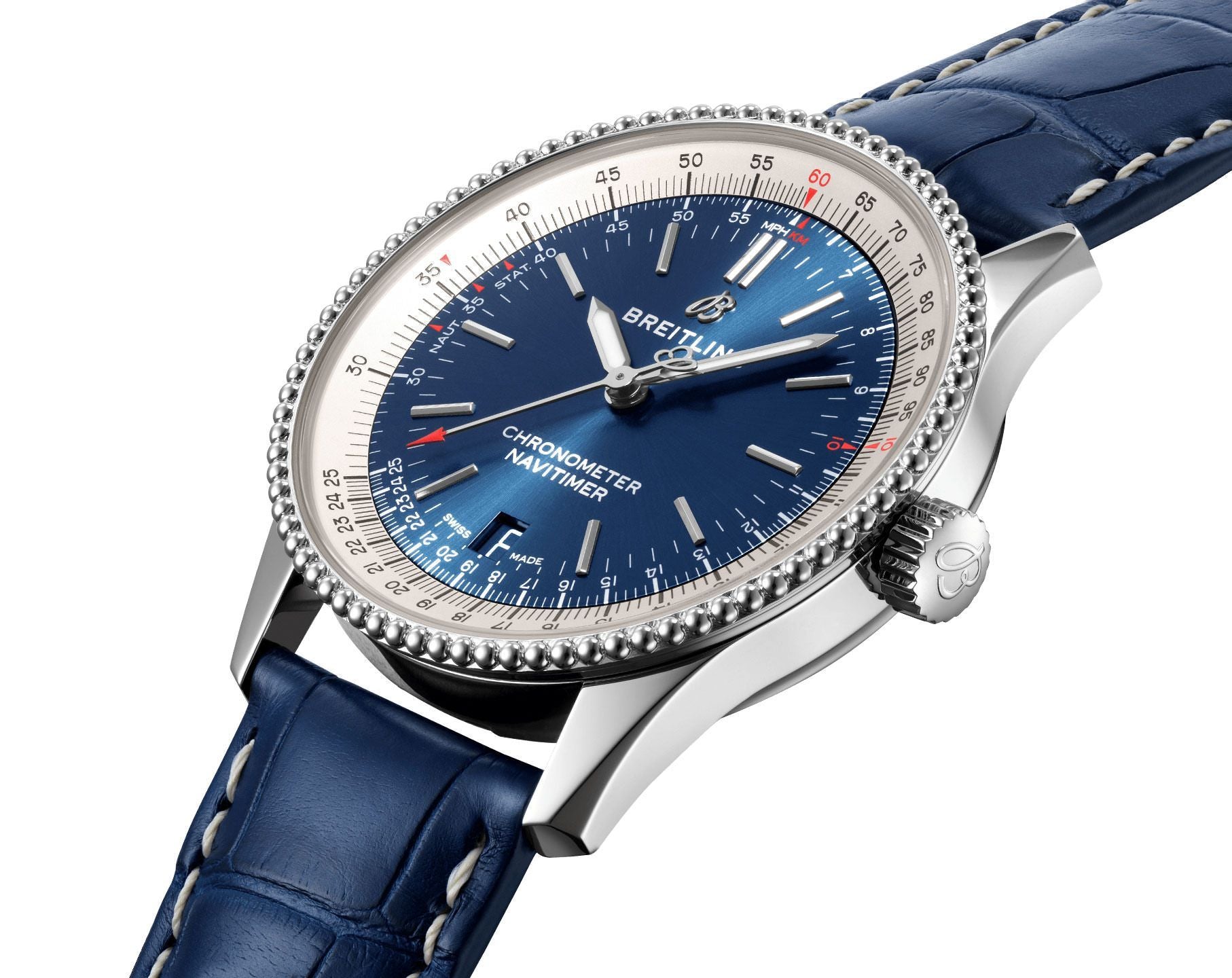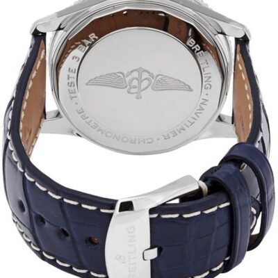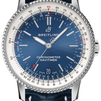 Breitling Navitimer Automatic 38 watch, polished stainless steel case, 38mm, Reference A17325211C1P1. This model has Blue dial with a fine sunray finish. Silver dial flange with Tachymeter scale. Polished luminous silver-tone hour and minute hands and applied steel index hour markers. Fine printed minutes/seconds track. Date window located the 6 o’clock positions. Stainless steel Pull/push non screw-locked crown with a two gaskets and logo Breitling. The dial closed by a Cambered sapphire crystal, glareproofed both sides. The screwed solid case back is made of Stainless Steel. The watch is equipped bidirectional rotating features a beaded Stainless Steel bezel. The watch is self-winding mechanical Breitling in-house caliber 17 contains 25 jewels and has an approximate power reserve of 38 hours. This model presented on a Blue Alligator/Crocodile Leather strap with a Stainless Steel Tang Buckle Clasp. The water resistance is up to 30m/100ft.