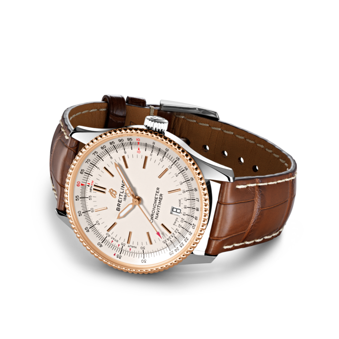 Refined and elegant unworn Breitling Navitimer Automatic 38 watch, case of polished stainless steel and 18k Red Gold , Reference U17325211G1P1. This model has Silver dial with a fine sunray finish and Tachymeter scale on dial flange. On the outer edge of the dial, there is a Navitimer scale with minutes and seconds in small print. The Watch is polished 18k Rose gold hour and minute hands with luminous fill also Red-tipped seconds hand, applied 18k Rose Gold index hour markers. The watch has polished stainless steel non screw-locked crown with two gaskets. The crown has a ribbed edge for a comfortable grip and Breitling logo. The dial closed by a Cambered sapphire crystal, glareproofed both sides. The screwed solid case back is made of Stainless Steel. The watch is equipped bidirectional rotating features a beaded 18k Red Gold bezel with slide rule. The watch is self-winding mechanical Breitling in-house caliber 17 contains 25 jewels and has an approximate power reserve of 38 hours. This model presented on a Brown Alligator /Crocodile Leather strap with a Stainless Steel Tang Buckle Clasp. The water resistance is up to 30m/100ft.