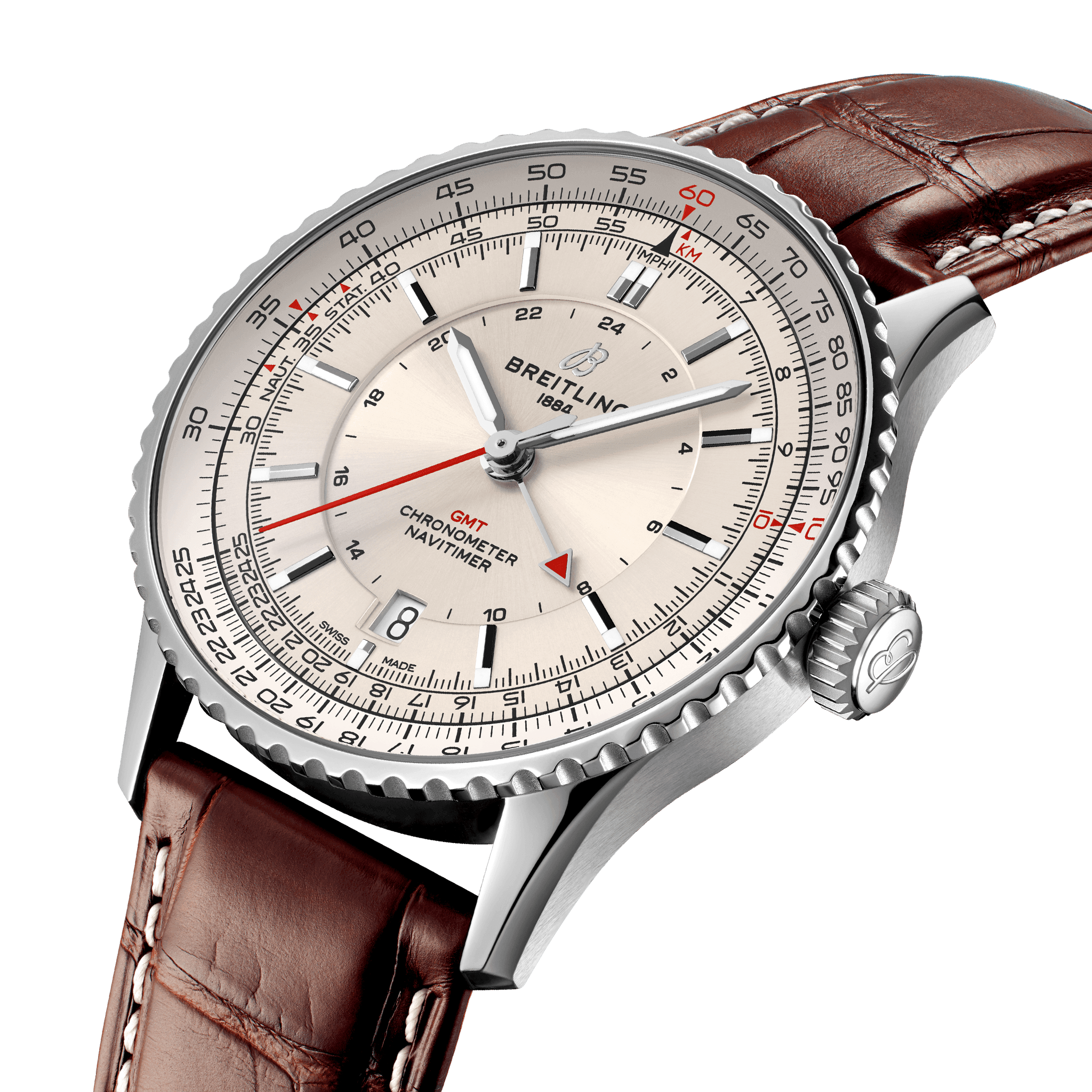 Unworn watch Breitling Navitimer Automatic GMT 41, brushed and polished stainless steel case, 41mm, Reference A32310211G1P1. This model has Cream dial with a fine sunray finish and effortlessly legible dual time zone system, is designed for the modern traveler. Polished steel hour and minutes hands with luminous fill and elegant red central second hand. Applied polished index hour markers with painted luminous segments at the tips. Fine printed minutes, seconds and fraction-of-a-second track. Date window displayed between the 6 o’clock position. GMT/2nd Time Zone: Indicated by an additional red arrow-head tipped hour hand; The GMT hour hand make a single full revolution every 24-hours (moving at the half the pace of the regular hour hand). This hand points to the silver 24-hour indicators printed on the inner circle of the dial; the 24-hour display is printed with small Arabic numerals for even hours, thin indexes for odd hours. Stainless steel Pull/push non screw-locked crown with a two gaskets and logo Breitling. The dial closed by a Cambered sapphire crystal, glareproofed both sides. The screwed solid case back is made of Stainless Steel. The watch is equipped bidirectional turning Bezel with the “Slide Rule” aka “Navigation Computer” which allows to compute different airborne calculations such as fuel consumption, climbing times and converting miles into nautical miles or kilometers. The watch is self-winding mechanical Breitling in-house caliber 32 contains 21 jewels and has an approximate power reserve of 42 hours. This model presented on a Straight Brown Alligator leather strap with a Stainless Steel Folding clasp. The water resistance is up to 30m/100ft.