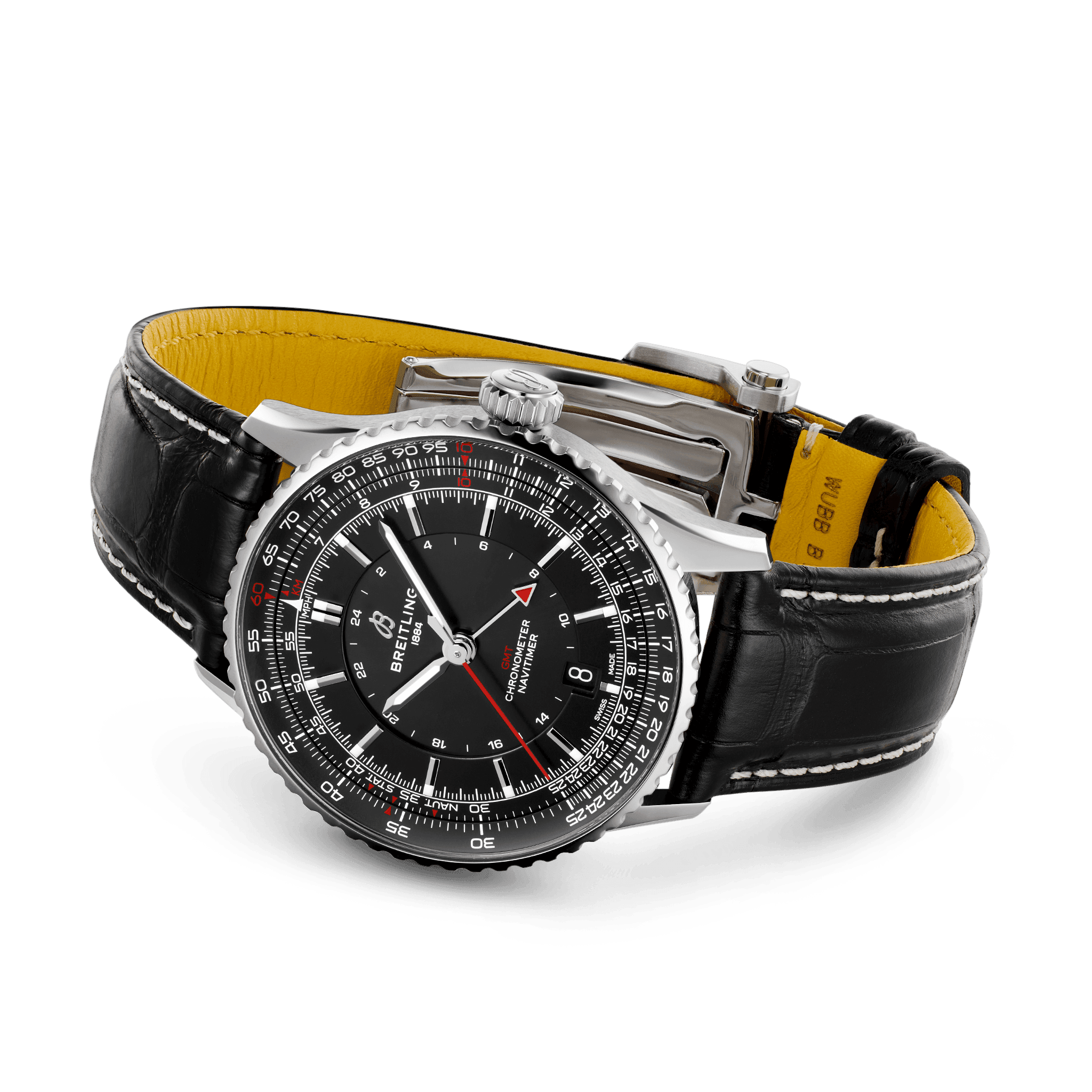 Unworn watch Breitling Navitimer Automatic GMT 41, brushed and polished stainless steel case, 41mm, Reference A32310251B1P1. This model has black dial and effortlessly legible dual time zone system, is designed for the modern traveler. Polished steel hour and minutes hands with luminous fill and elegant red central second hand. Applied polished index hour markers with painted luminous segments at the tips. Fine printed minutes, seconds and fraction-of-a-second track. Date window displayed between the 6 o’clock position. GMT/2nd Time Zone: Indicated by an additional red arrow-head tipped hour hand; The GMT hour hand make a single full revolution every 24-hours (moving at the half the pace of the regular hour hand). This hand points to the silver 24-hour indicators printed on the inner circle of the dial; the 24-hour display is printed with small Arabic numerals for even hours, thin indexes for odd hours. Stainless steel Pull/push non screw-locked crown with a two gaskets and logo Breitling. The dial closed by a Cambered sapphire crystal, glareproofed both sides. The screwed solid case back is made of Stainless Steel. The watch is equipped bidirectional turning Bezel with the “Slide Rule” aka “Navigation Computer” which allows to compute different airborne calculations such as fuel consumption, climbing times and converting miles into nautical miles or kilometers. The watch is self-winding mechanical Breitling in-house caliber 32 contains 21 jewels and has an approximate power reserve of 42 hours. This model presented on a Straight Black Alligator leather strap with a Stainless Steel Folding clasp. The water resistance is up to 30m/100ft. .