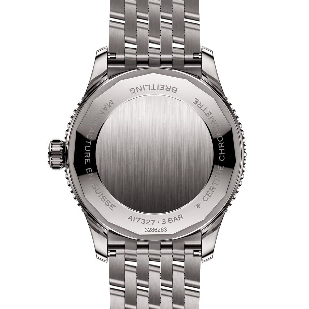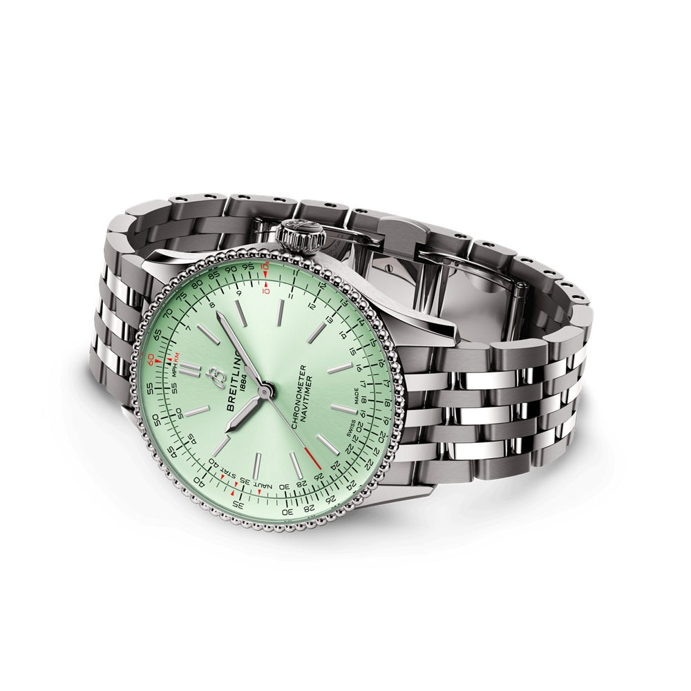 Unworn Breitling Navitimer Automatic A17327361L1A1, 36 mm, Mint green dial, Stainless steel case. Bidirectional, slide rule bezel. Cambered sapphire, glareproofed both sides crystal. Breitling 17 calibre, Self-winding mechanical movement, 38 hrs power reserve, 26 jewels. Stainless steel bracelet. Water resistance 30 m.