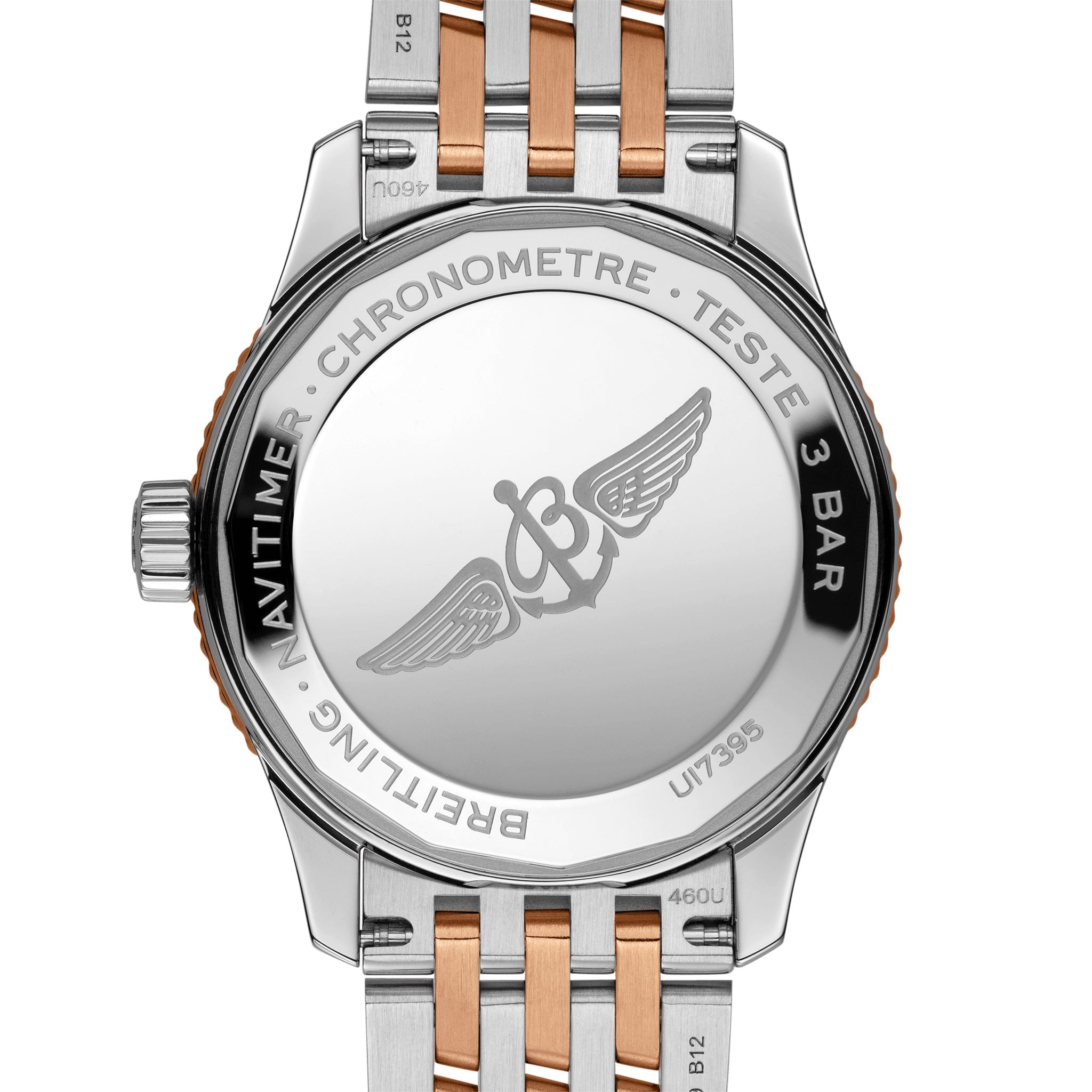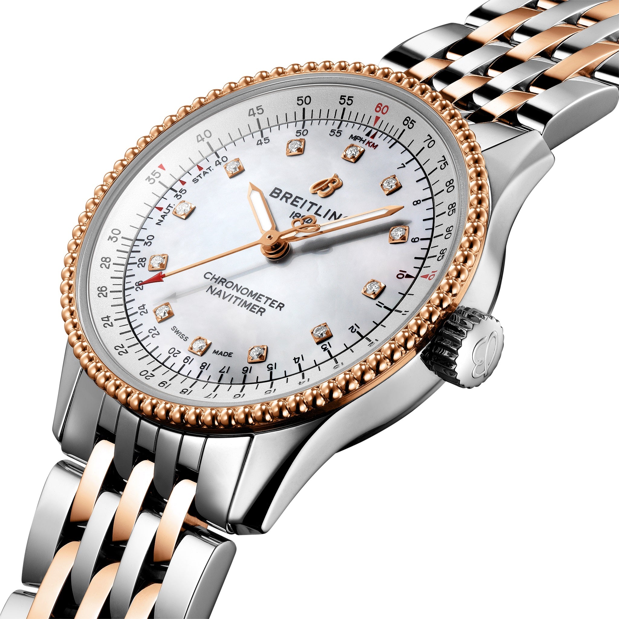 Unworn Breitling Navitimer AUTOMATIC Ref# U17395211A1U1, 35 mm, White mother of pearl dial, Stainless steel & 18k red gold case. Bidirectional, slide rule bezel. Convex sapphire crystal, glareproofed both sides crystal. Breitling 17 calibre, Self-winding mechanical movement, 38 hours power reserve, 26 jewels. Stainless steel & 18k red gold bracelet with Folding clasp. Water resistance 30 m.