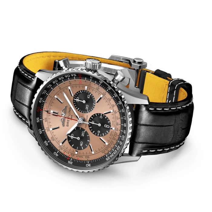 Breitling Navitimer B01 Chronograph. Copper Dial 43 mm Stainless Steel case. Bidirectional, slide rule bezel. Cambered sapphire, glareproofed both sides crystal. Breitling 01 calibre, Self-winding mechanical, 70 hours power reserve, 47 jewels. Alligator Leather strap Folding clasp. Water resistance 30 m