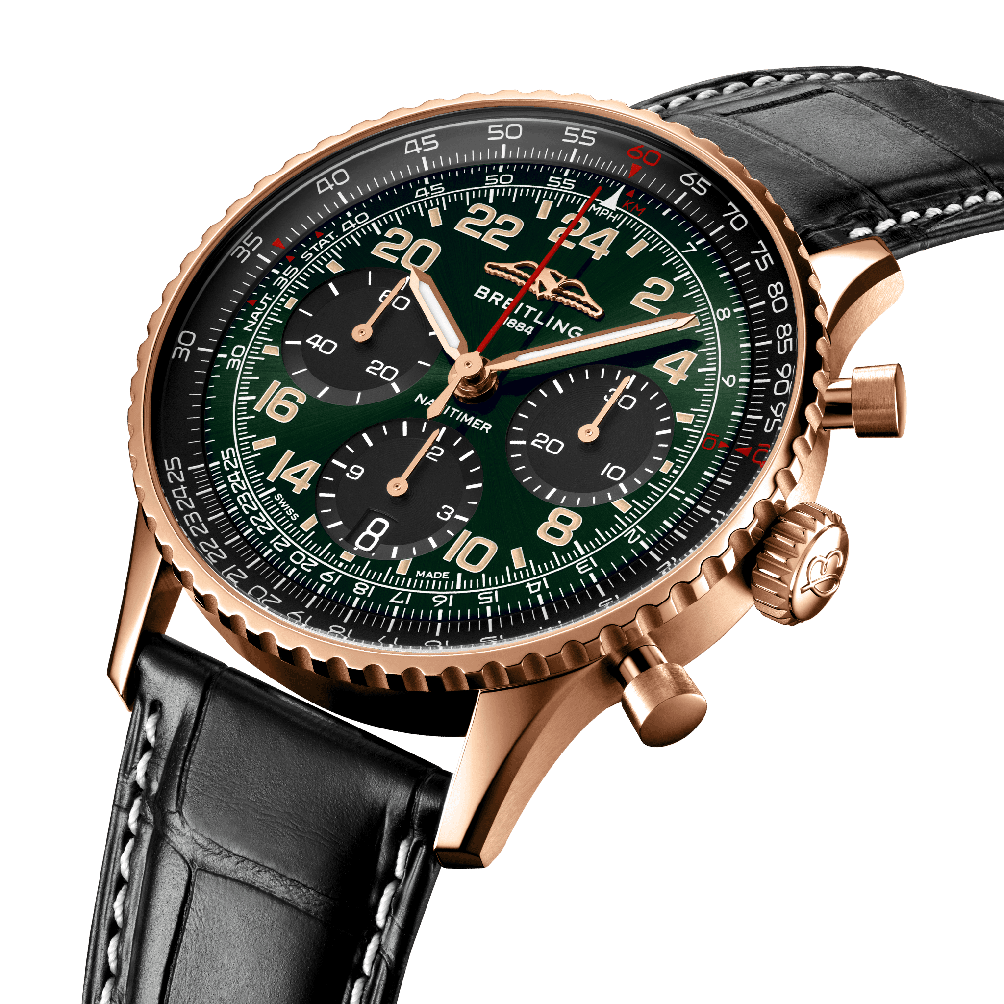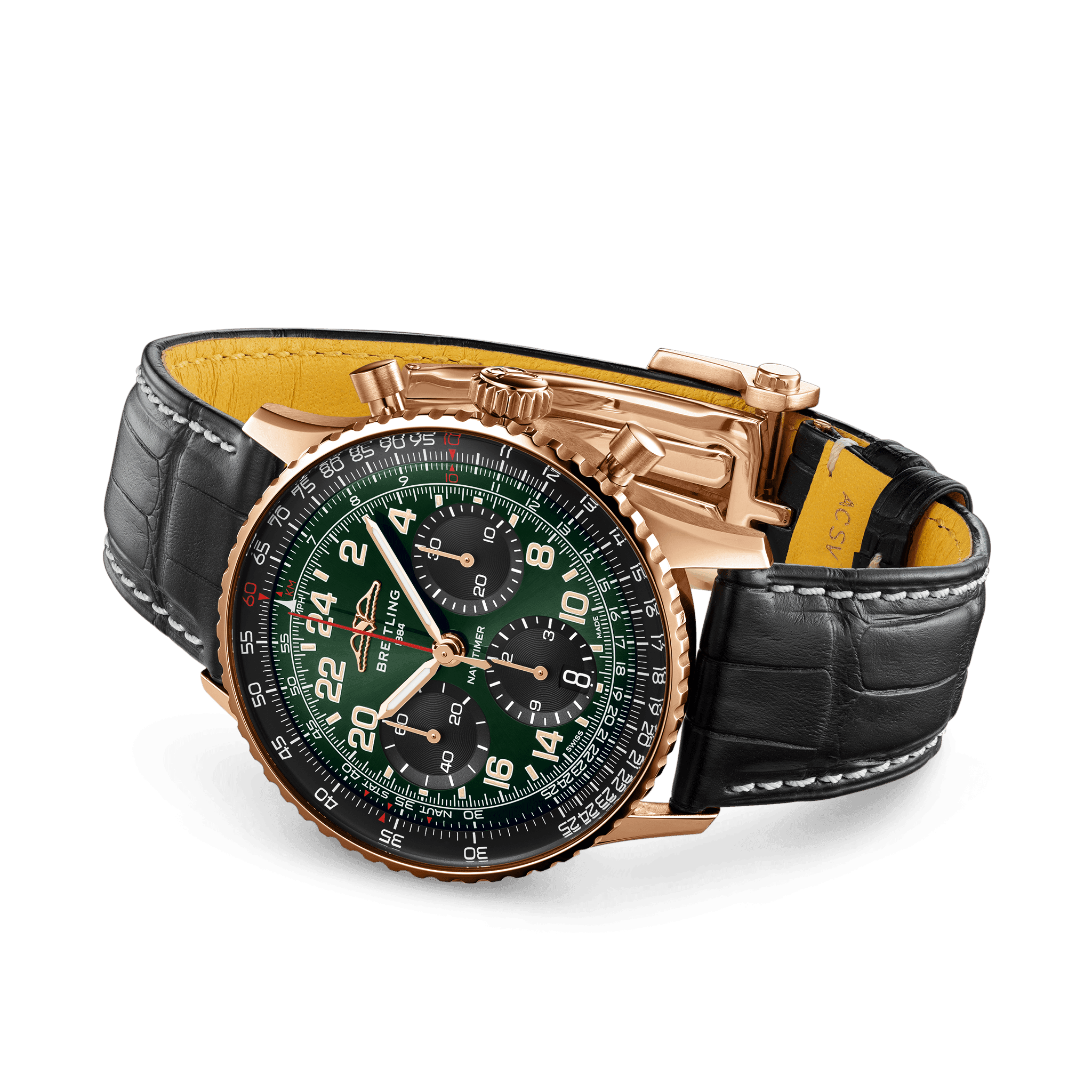Unworn watch Breitling Navitimer B12 Chronograph 41 Cosmonaute, Reference RB12302A1L1P1 – it’s not just a watch; it is a testament to precision engineering, luxury and timeless elegance. Crafted with meticulous attention to detail, they combine sophistication and functionality. At first glance, the elegant 41mm 18k Red Gold case strikes the eye, striking the perfect balance between classic and modern. The 24-hour Green dial, Rose Gold-colored hour and minute hands with luminous fill, large Arabic numerals as hour markers ensure high readability even in poor visibility. Impressive are the AOPA wings, symbol of the Aircraft Owners and Pilots Association, the largest pilots’ club in the world, which in the 1950s chose the Navitimer as its official watch at 12 o’clock. The intricate workings of the watch are demonstrated by a chronograph, which includes the elegant red central second hand; black sub-dial for 30-minute counter at 3 o’clock; black 12-hour counter subdial at 6 o’clock. While the iconic circular slide rule adds, a touch of aviation heritage. The watch also has a second’s subdial at 9 o’clock and a date indicator at 6 o’clock. The dial is covered with a domed scratch-resistant sapphire crystal with anti-reflective coating on both sides. The transparent sapphire crystal case back reveals the mesmerizing operation of the movement. The dial is framed by a signature bi-directional fluted 18k Red Gold bezel with a scalloped profile for easy grip. A masterpiece of engineering, Breitling’s in-house Caliber 12 contains 47 jewels and has an approximate power reserve of 70 hours, ensuring exceptional precision, allowing you to conquer every moment with unwavering precision. The watch presented on the Black Alligator leather strap with 18k Red Gold l Folding Clasp. The water resistance is up to 30m/99ft (3 ATM).
