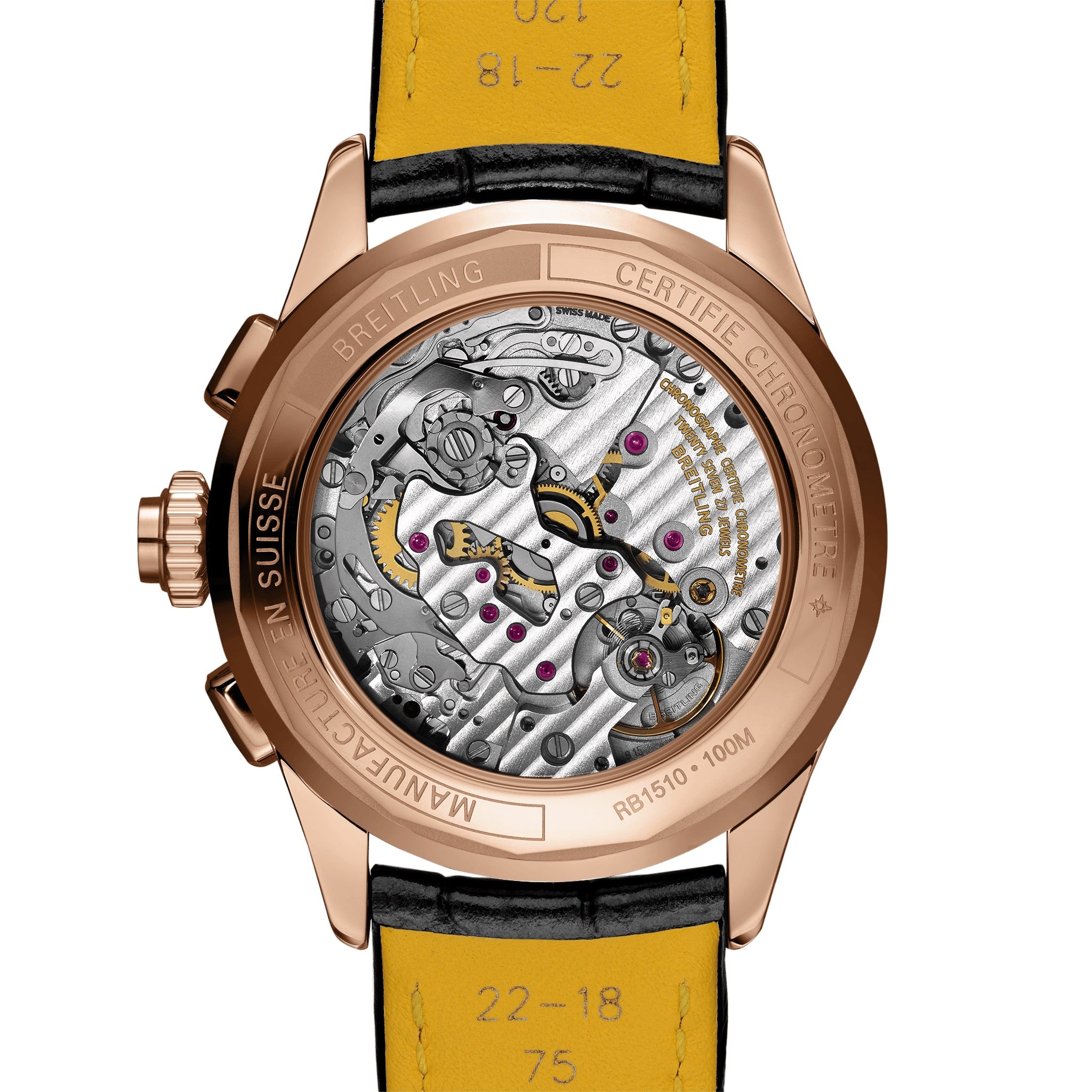 Unworn Breitling Premier B15 DUOGRAPH RB1510251B1P1, 42 mm, Black dial, 18k red gold case. Fixed bezel. Cambered sapphire, glareproofed both sides crystal. Breitling B15 (Manufacture) calibre, Mechanical hand-wound movement, 70 hrs power reserve, 27 jewels. Alligator leather strap with Folding clasp. Water resistance 100 m.