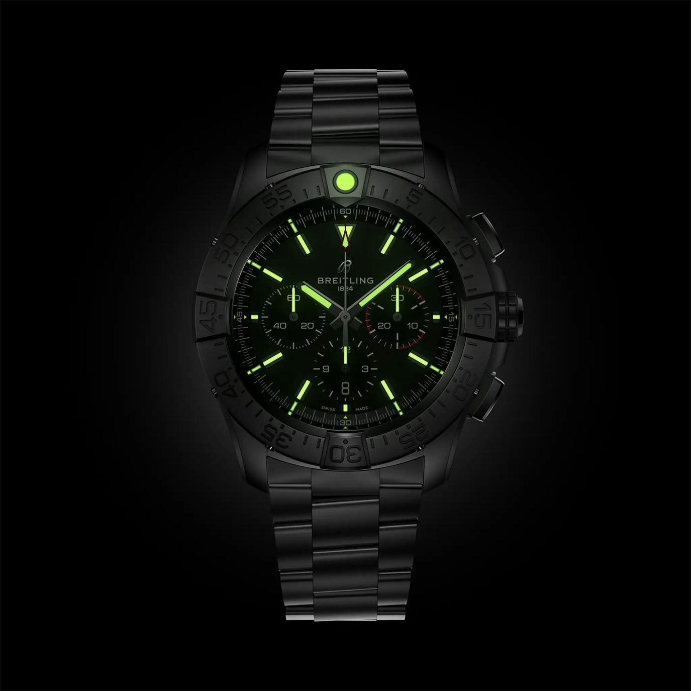 Introducing the Breitling Super Avenger B01 Chronograph 46—a commanding timepiece that masterfully combines robust functionality with sophisticated design, tailored for aviation enthusiasts and professionals alike. This model boasts a substantial 46mm titanium case, offering exceptional durability while maintaining a lightweight profile for optimal comfort. The striking black dial enhances its distinctive aesthetic, complemented by a matching titanium bracelet that ensures both style and resilience. At its heart lies the in-house Breitling Manufacture Caliber 01, a self-winding mechanical movement renowned for its precision and reliability. With an impressive water resistance of up to 300 meters (1,000 feet), the Super Avenger B01 Chronograph 46 is engineered to perform seamlessly across diverse environments, from high-altitude flights to deep-sea explorations.